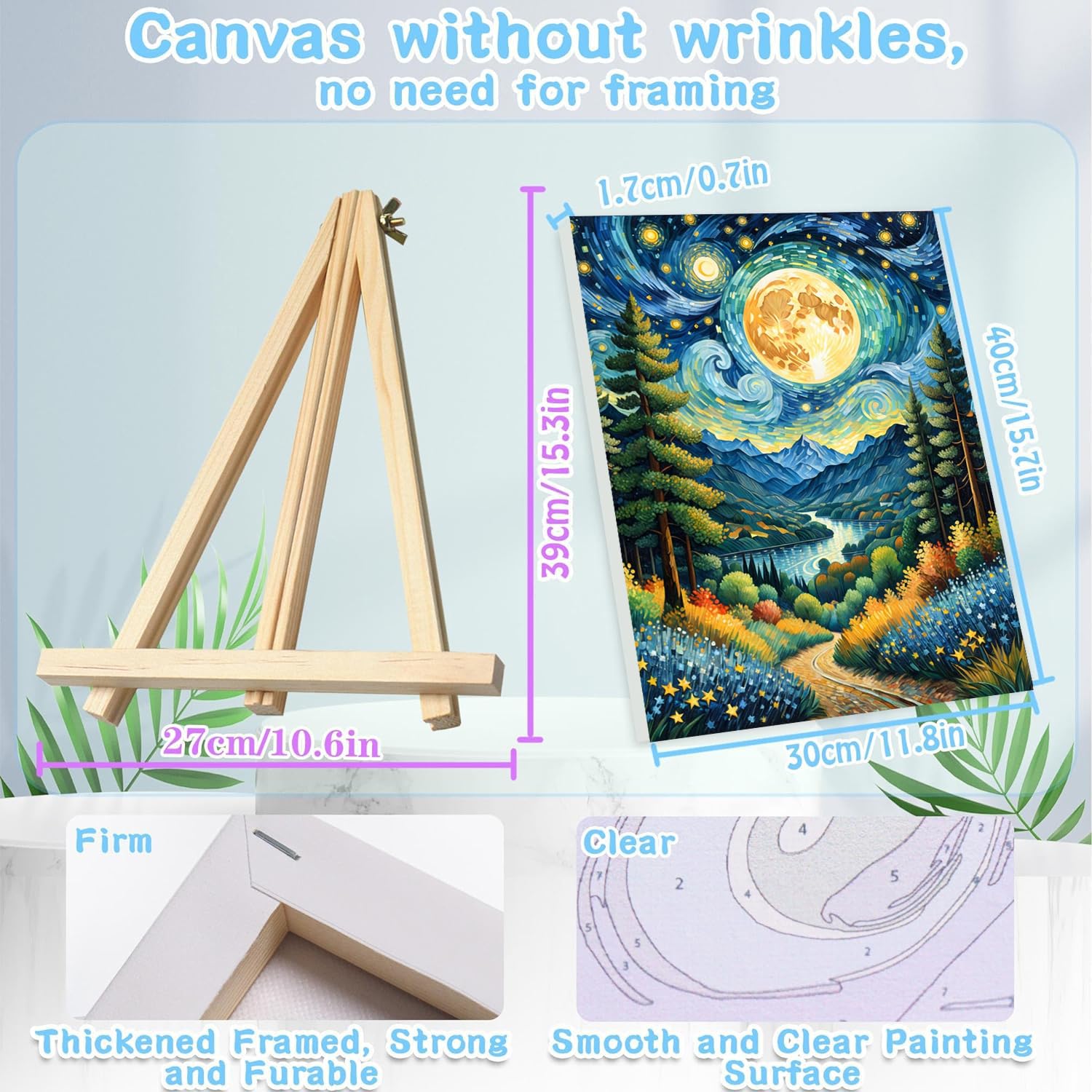 VIGEGU 4 Pack Paint by Numbers Kit for Adults with Frame,Paint by Number with Wooden Easel DIY Mountain Moon Tree Landscape Adult Paint by Number Kits for Home Decor12x16inch