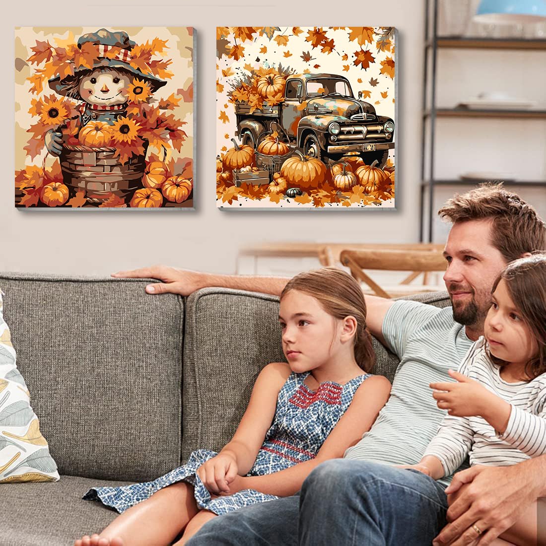 VIGEGU 4 Pack Thanksgiving Paint by Numbers Kit for Adults with Framed,Fall Pumpkin Paint by Number with Wooden Easel DIY Autumn Scarecrow Truck Adult Paint by Number Kits for Wall Decor 10x10in