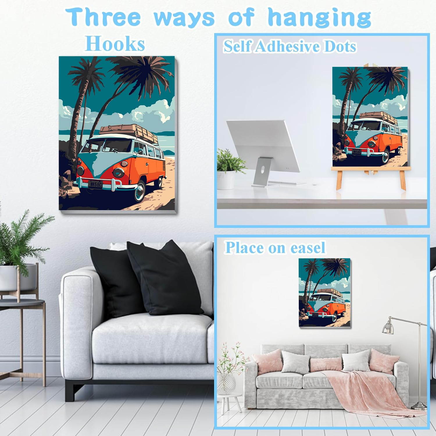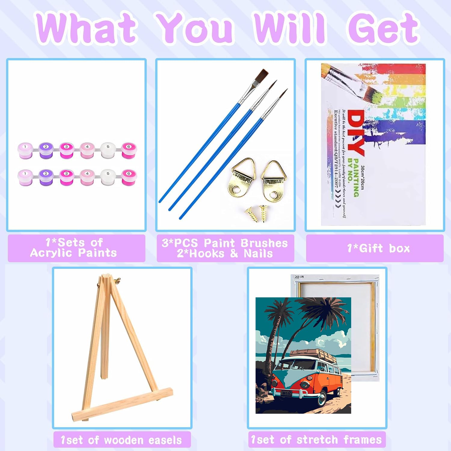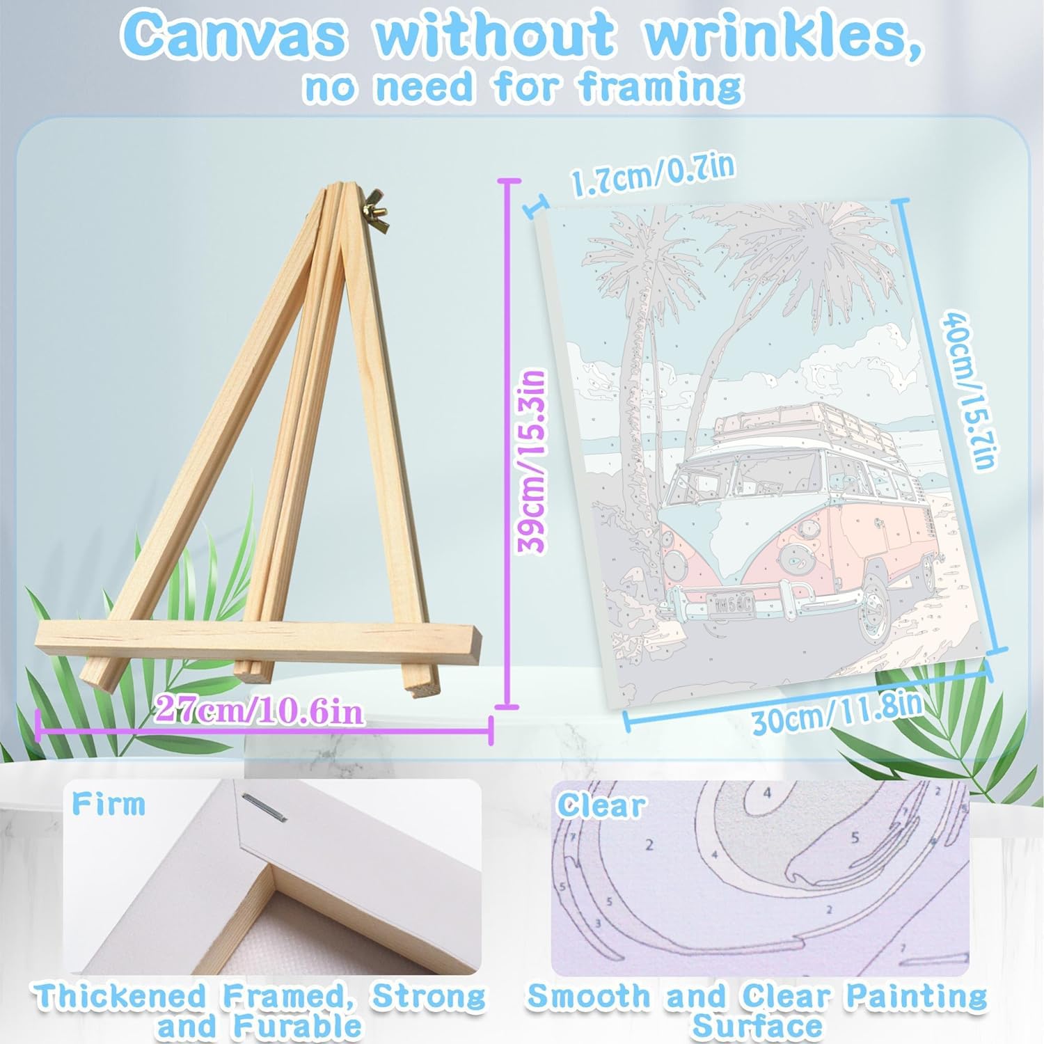 VIGEGU Paint by Numbers kit for Adults Beginner Framed - with Wooden Easel Gift Box,Paint by Numbers with Frame Beach Car DIY Adults' Paint-by-Number Kits for Wall Decor 12x16inch