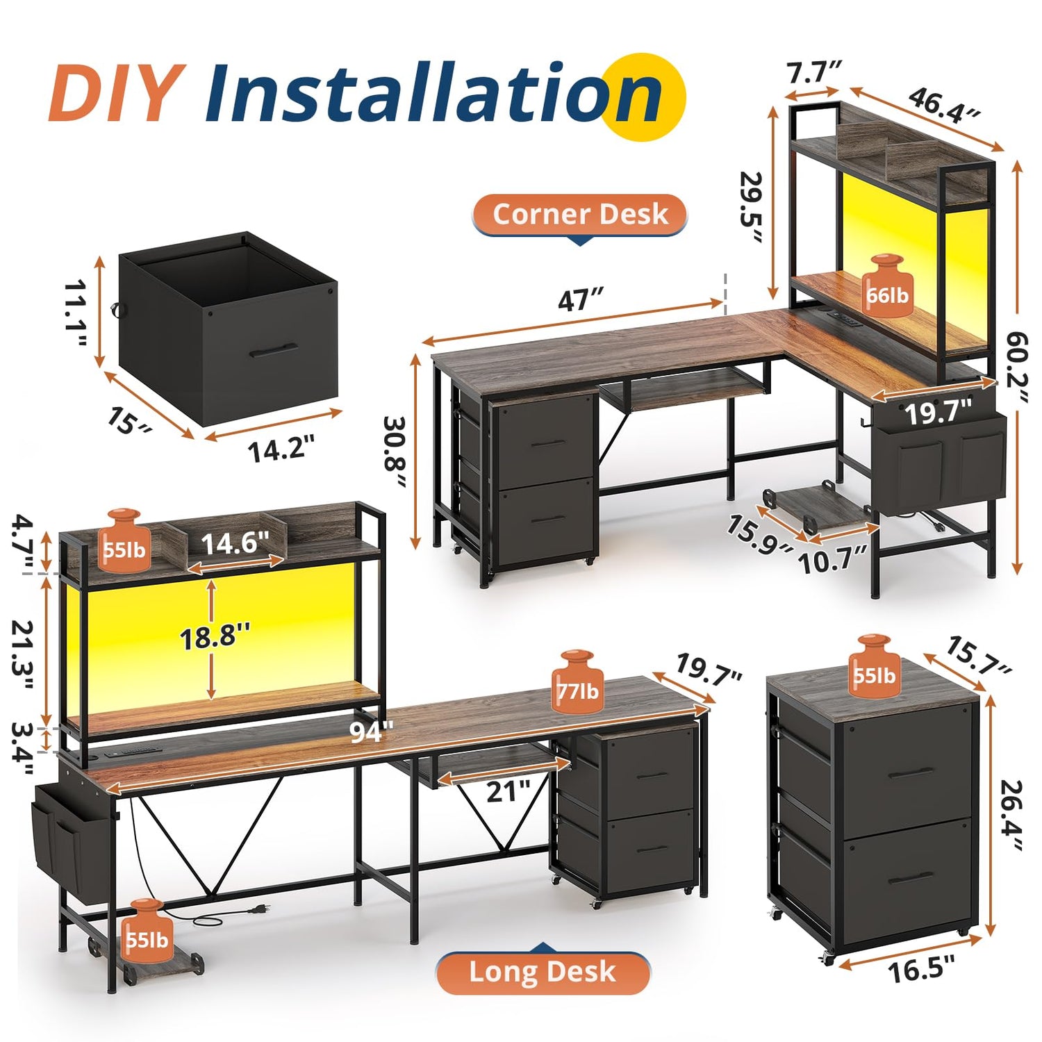 - 【Ample Storage Space】The writing desk includes a mobile storage cabinet and CPU stand, storage bag, keyboard tray, high-rise storage shelf, and headphone hook. The printer can be placed on a storage cabinet, and the drawers have removable 360-degree rotating file hanging rods. The 21in keyboard tray can accommodate a variety of office or gaming keyboards.