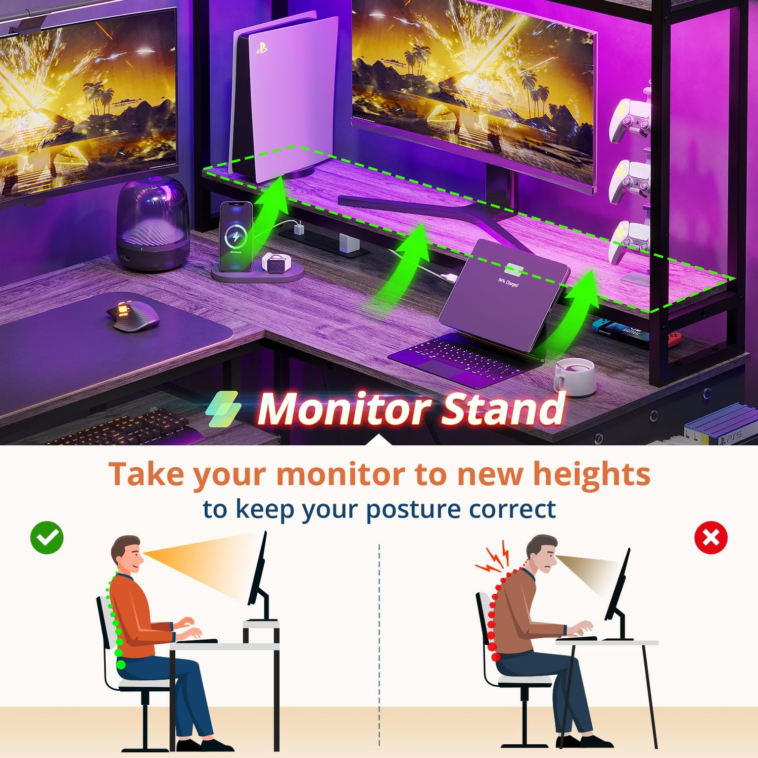 - 【Power Outlets & LED Light】The gaming desk is equipped with RGB LED lights, which feature over 60,000 colors and 29 flash patterns controlled via APP or keystrokes, with the colors changing to the rhythm of music on your phone. The computer desk includes 4 outlets and 2 USB ports to power 6 devices simultaneously including phones, tablets, and laptops.