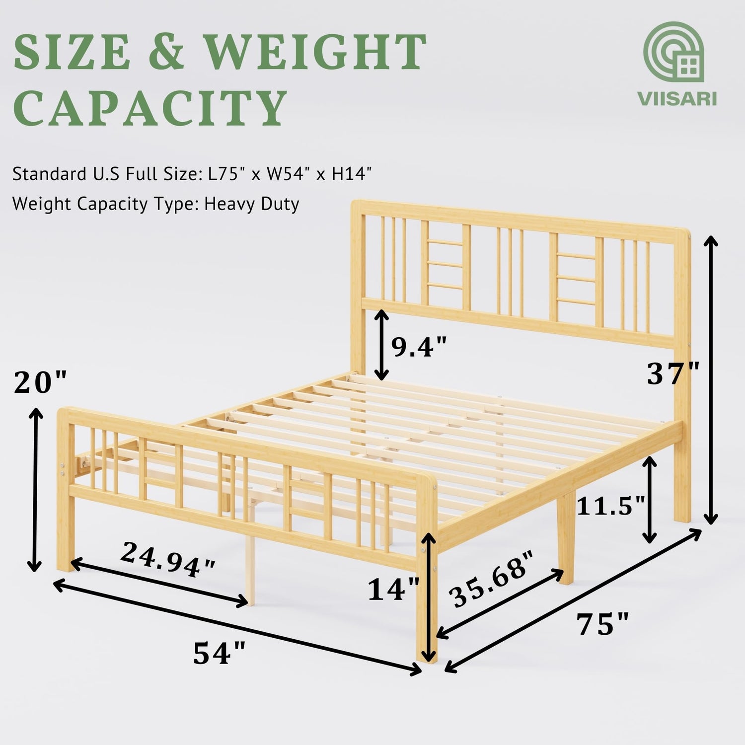 Viisari Bamboo Wood Bed Frame Full with Headboard and Footboard, 14 Inch Platform Full Size Bed Frame with Steel Slats, Solid Foundation, Easy Assembly, Ample Under-Bed Storage, Noise-Free