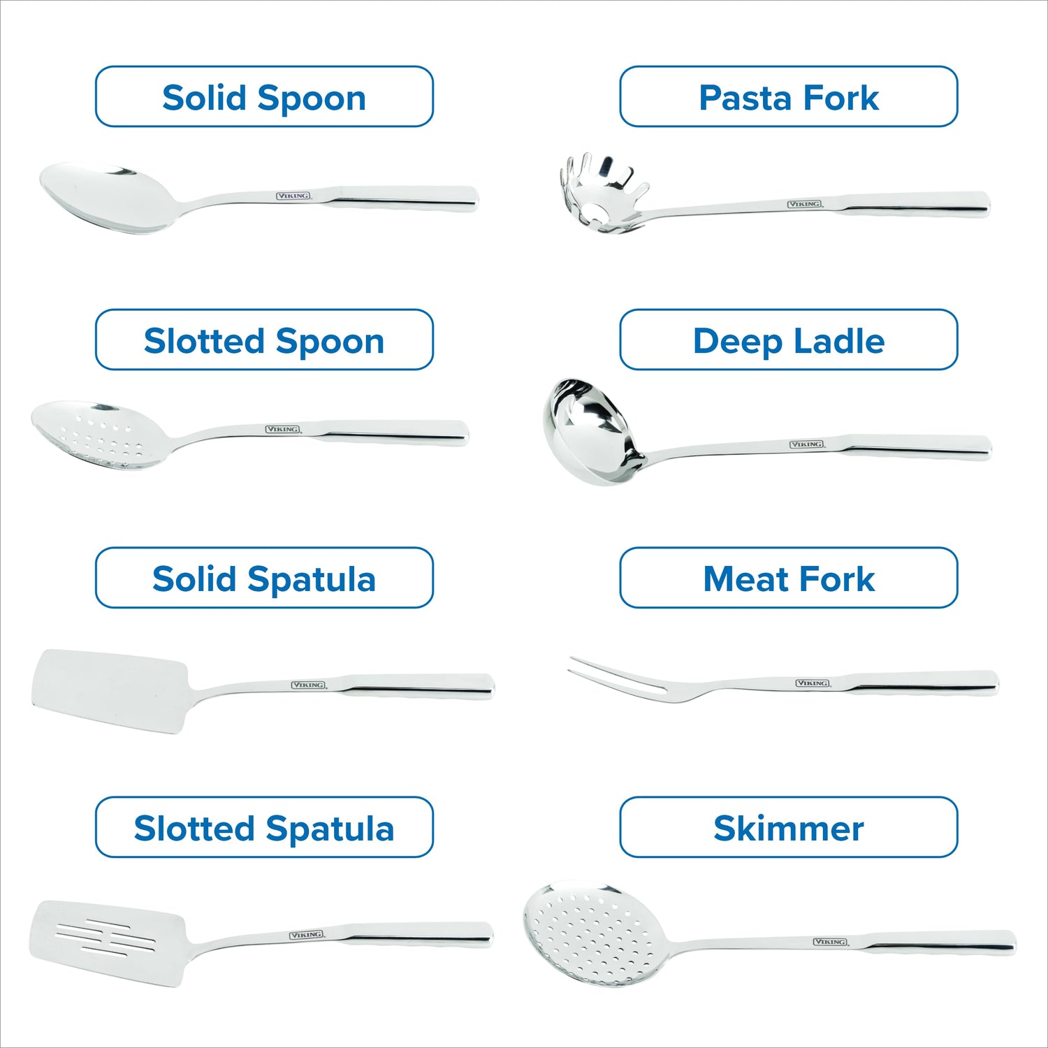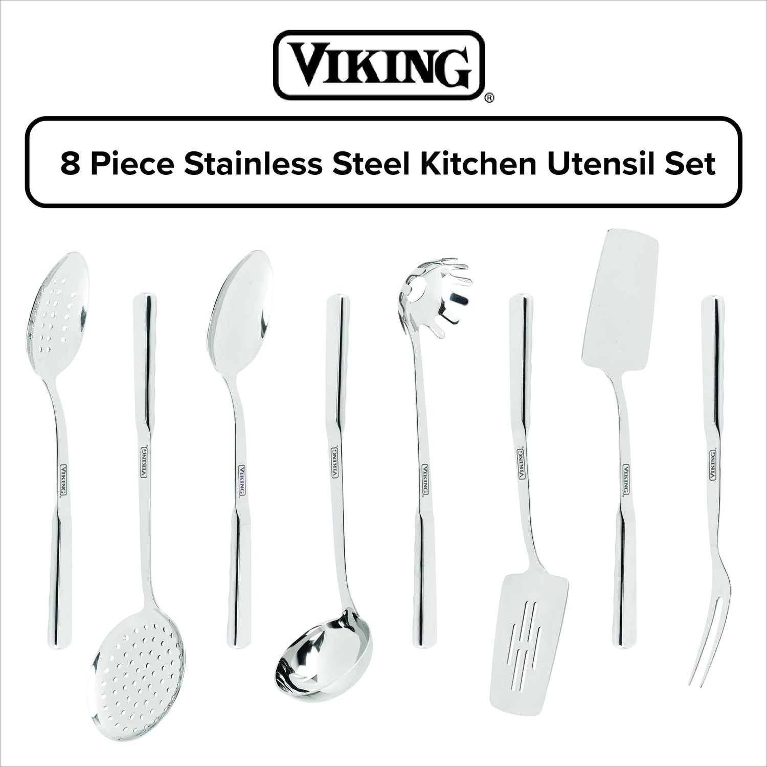 - 8 PIECE COOKING UTENSILS SET: Elevate your home culinary experience with the Viking 8 Piece Kitchen Supplies Set! Crafted with sleek long-lasting stainless steel, our kitchen accessories set includes (1) slotted spoon, (1) solid spoon, (1) slotted spatula, (1) solid spatula, (1) pasta fork, (1) deep ladle, (1) meat fork and (1) skimmer, offering a wide range of essential tools used by both novice and seasoned home chefs