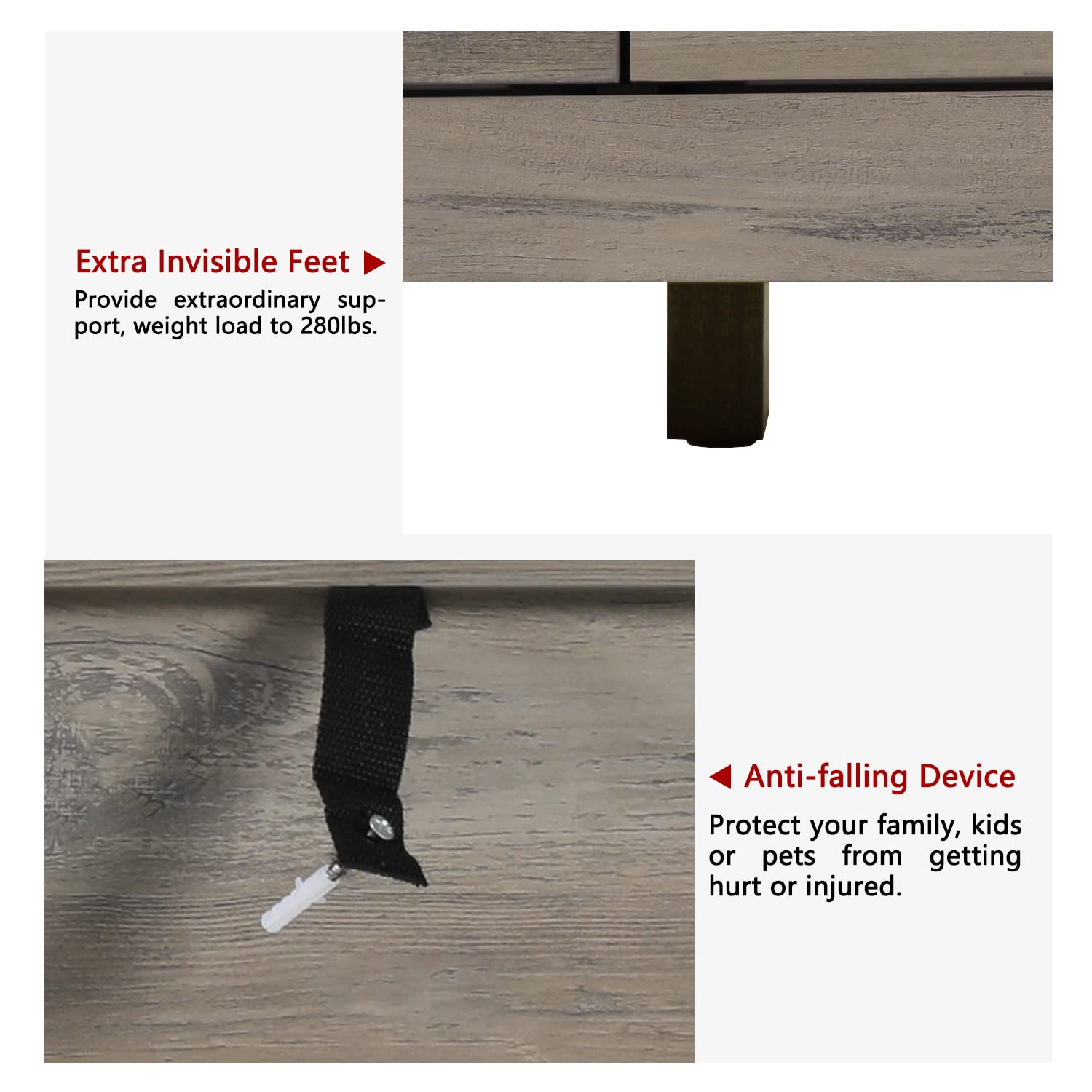 - 【Sturdy Wooden Dresser】-- Coming with 2 anti-dumping device; Wooden dresser is made of quality P2 particle board wood. which make this wooden dresser scratch-resistant and wear-resistant.