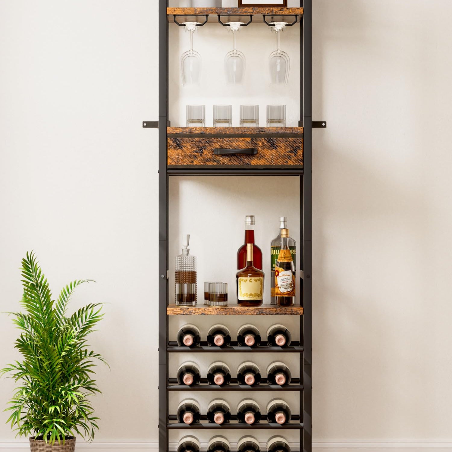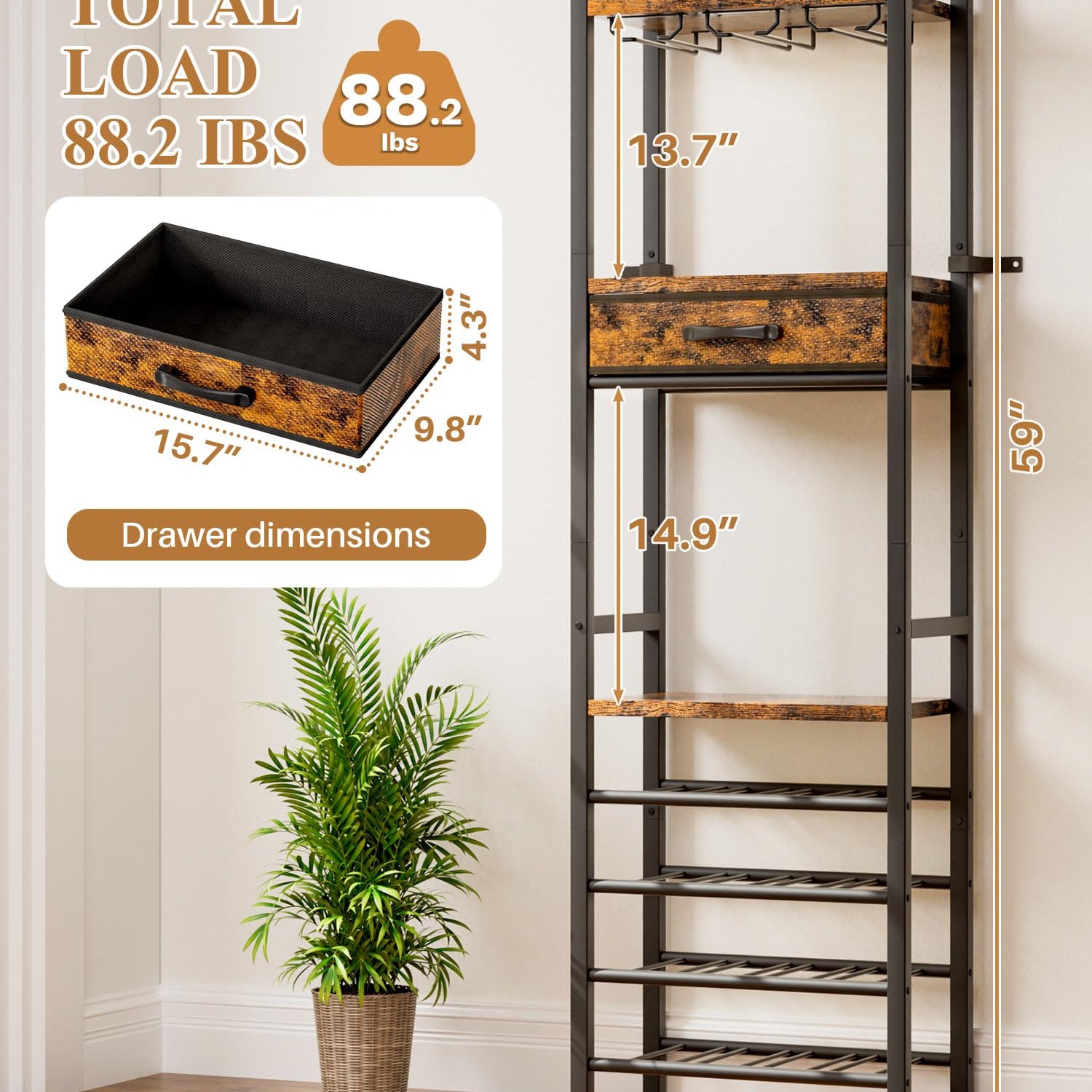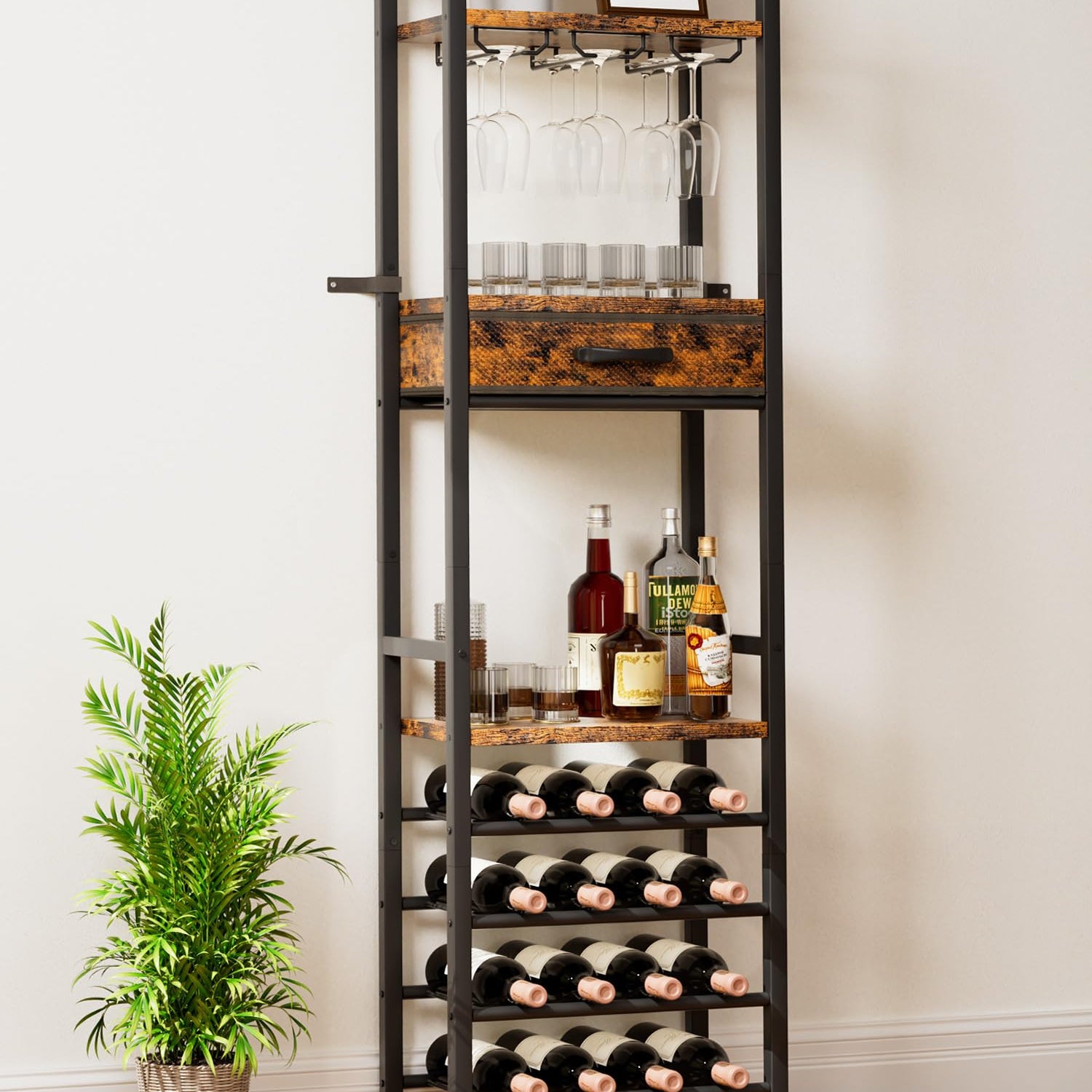 Vilaxing Wine Rack Freestanding Floor, Liquor Bar Cabinet with Storage Drawer, 4-Tier Bottle and 3-Row Glass Holder with Tabletop for Home Kitchen Living Room
