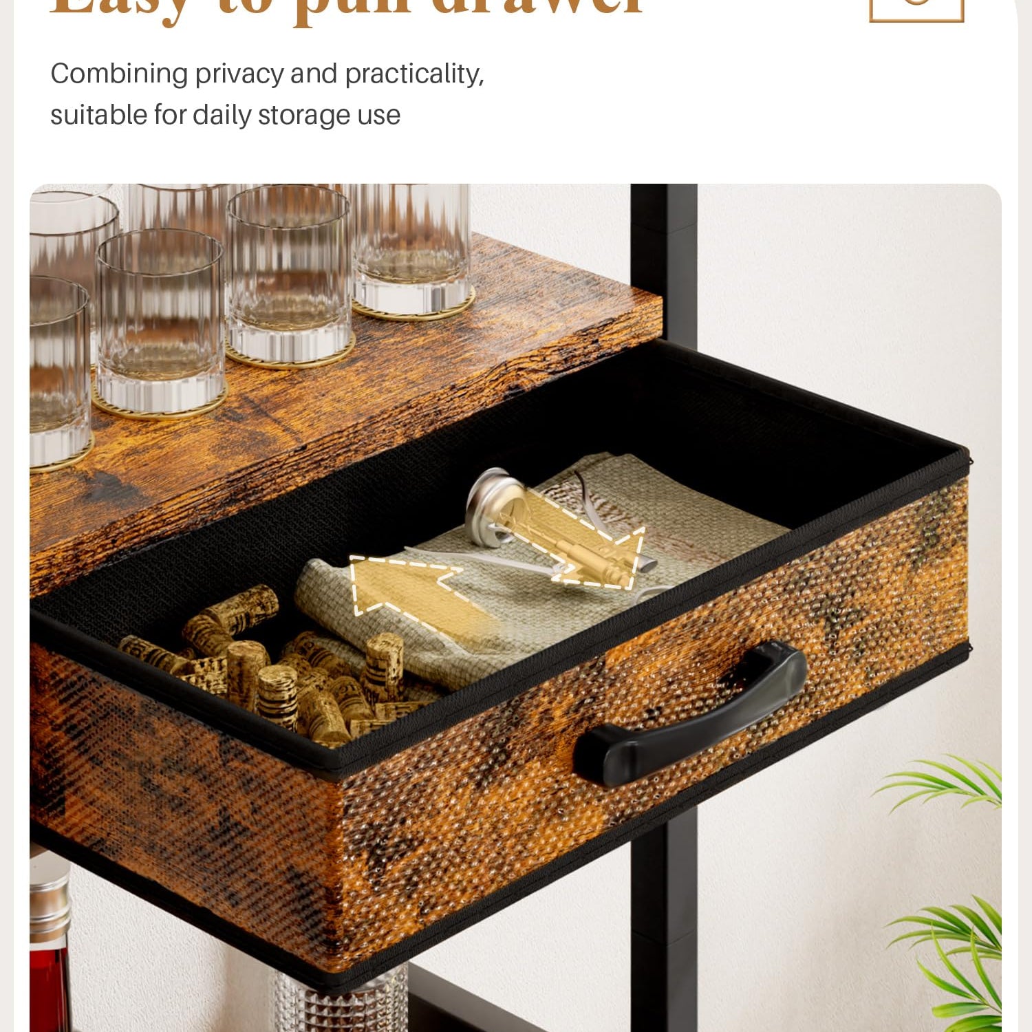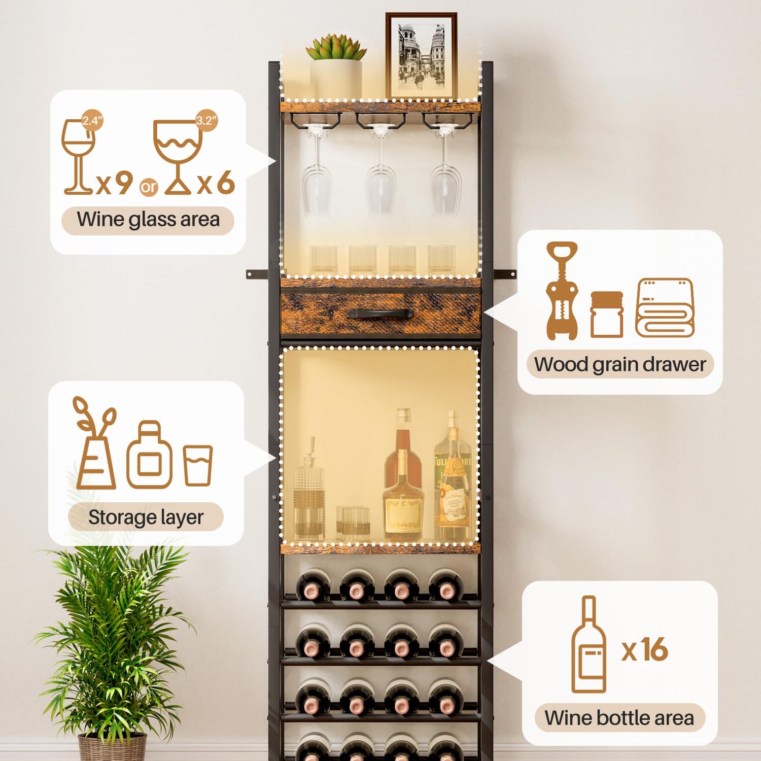 - Large Capacity: With 4 layers of wine bottle rack and 3 rows wine glass holders, our wine rack cabinet can store a total of 16 bottles and 9 wine glasses. There also are drawers, integrating the storage of wine bottle racks, wine glass racks, and wine corks. It truly becomes your ultimate wine base station, providing ample space to neatly organize and showcase your wine collection