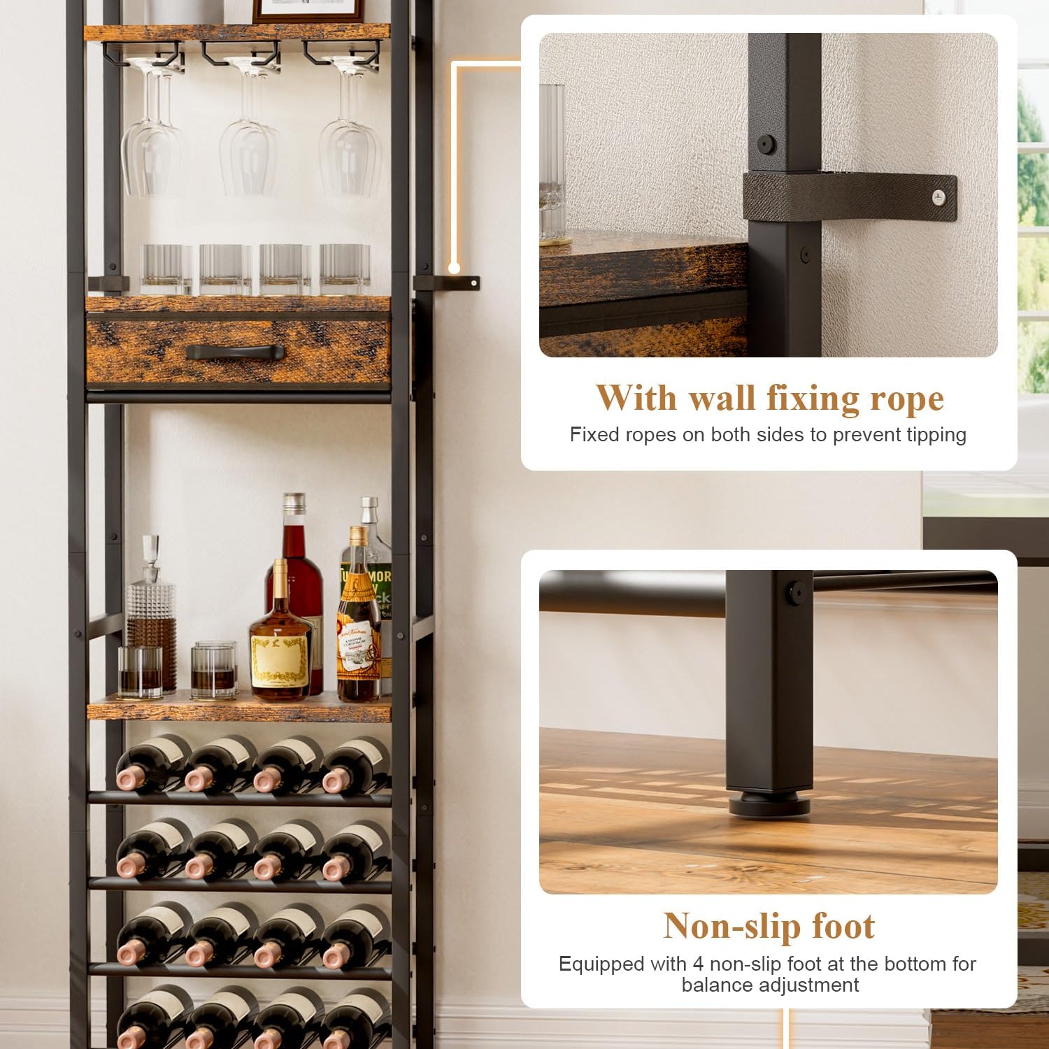 - Thoughtful Settings: The bottom of thiswine rack freestanding floor for wine bottles and glasses is equipped with anti-slip adjustable feet, allowing it to adapt to various floor heights with ease. Additionally, it comes with a wall-mounted fixing rope for added security, preventing any accidental toppling. Such thoughtful details ensure your wine collection stays safe and stable