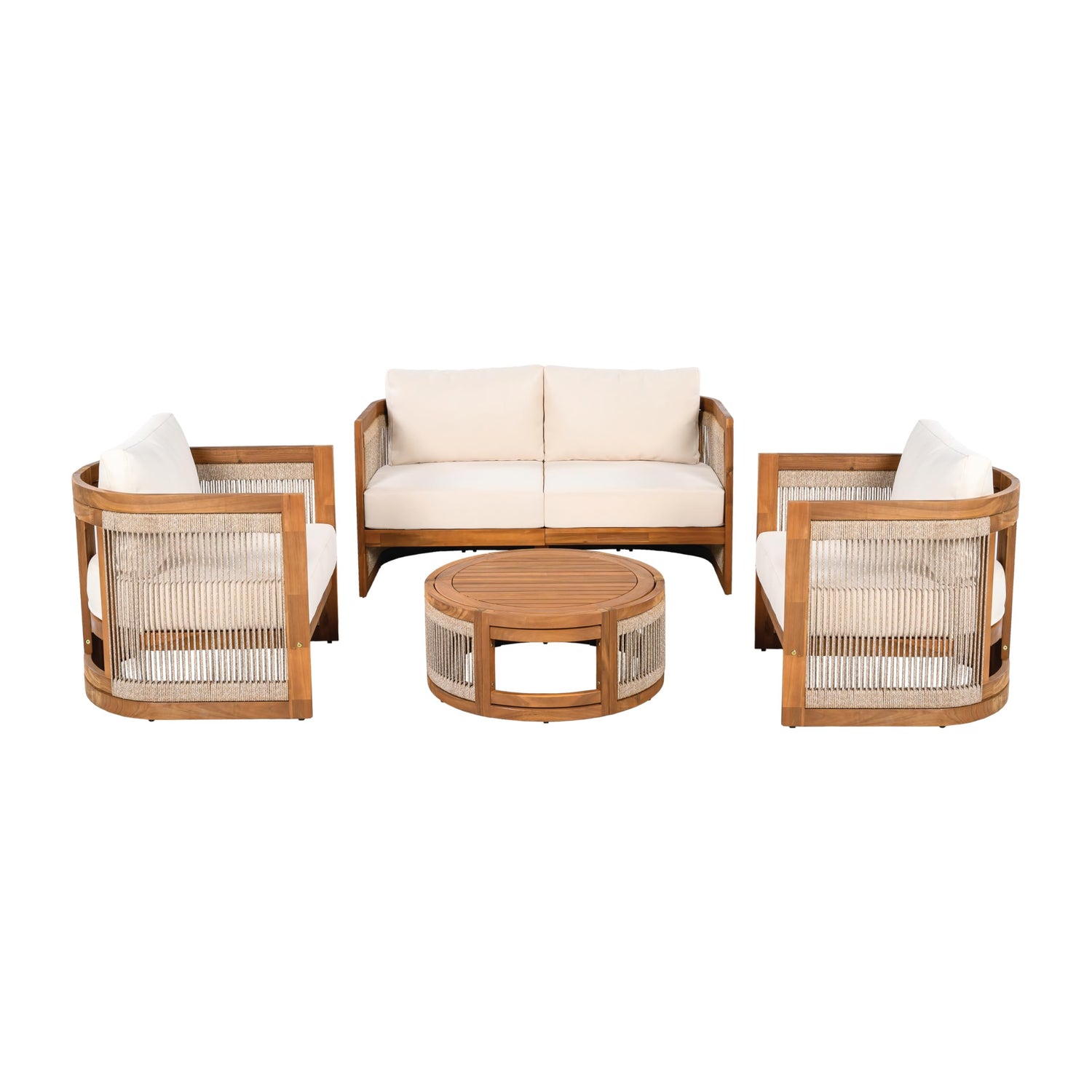 VilroCaz 4-Piece Patio Conversation Set, All Weather Sectional Sofa Set w/ 2 Chairs, Loveseat & Table Premium, Acacia Wood Outdoor Furniture Set with Woven Rope Accents and Cushions (Teak+Beige)