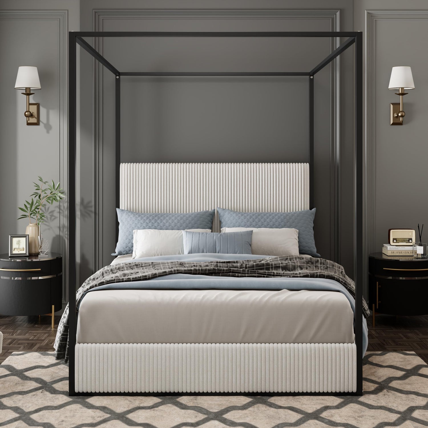 VilroCaz Modern King Size Canopy Platform Bed with Upholstery Channel Tufted Headboard, Metal 4-Poster Canopied Design Platform Bed Frame with Strong Slats Support (White+Black-King)