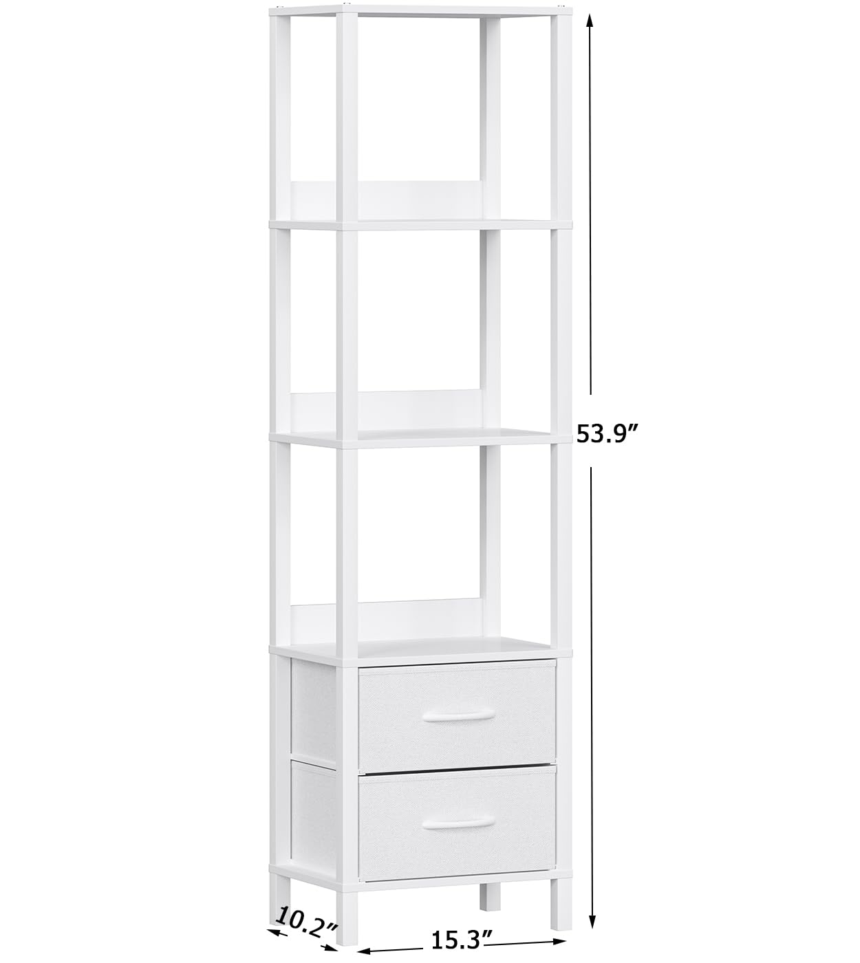 - [Dual Non-Woven Fabric Drawers] The tall bookshelf with two drawers made from durable non-woven fabric are perfect for storing smaller items like stationery, remote controls, or even personal items. The fabric is easy to clean and maintains its shape over time.