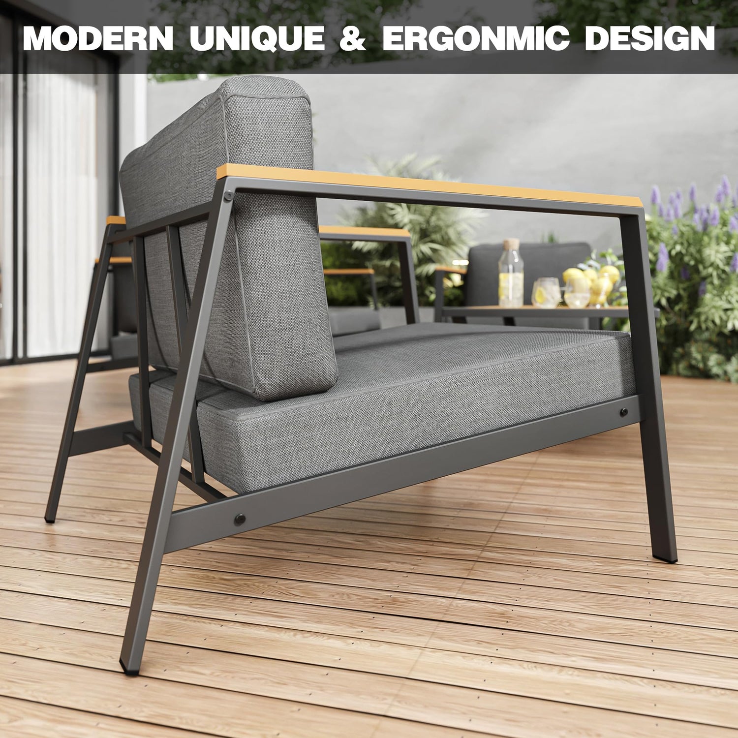 • 【Stylish Design:】The synthetic wood panels on the armrests complement its modern minimalist style. It fits perfectly with any indoor or outdoor décor, such as outdoor patios, porches, backyards, balconies, poolside, gardens, and other suitable places in your home.