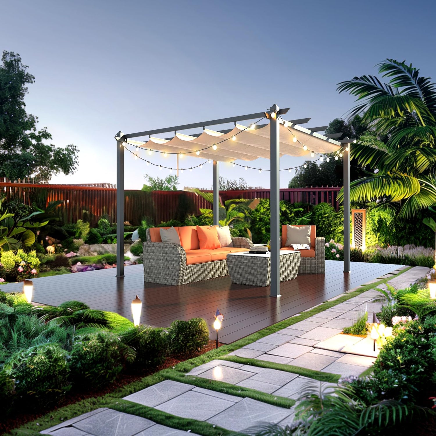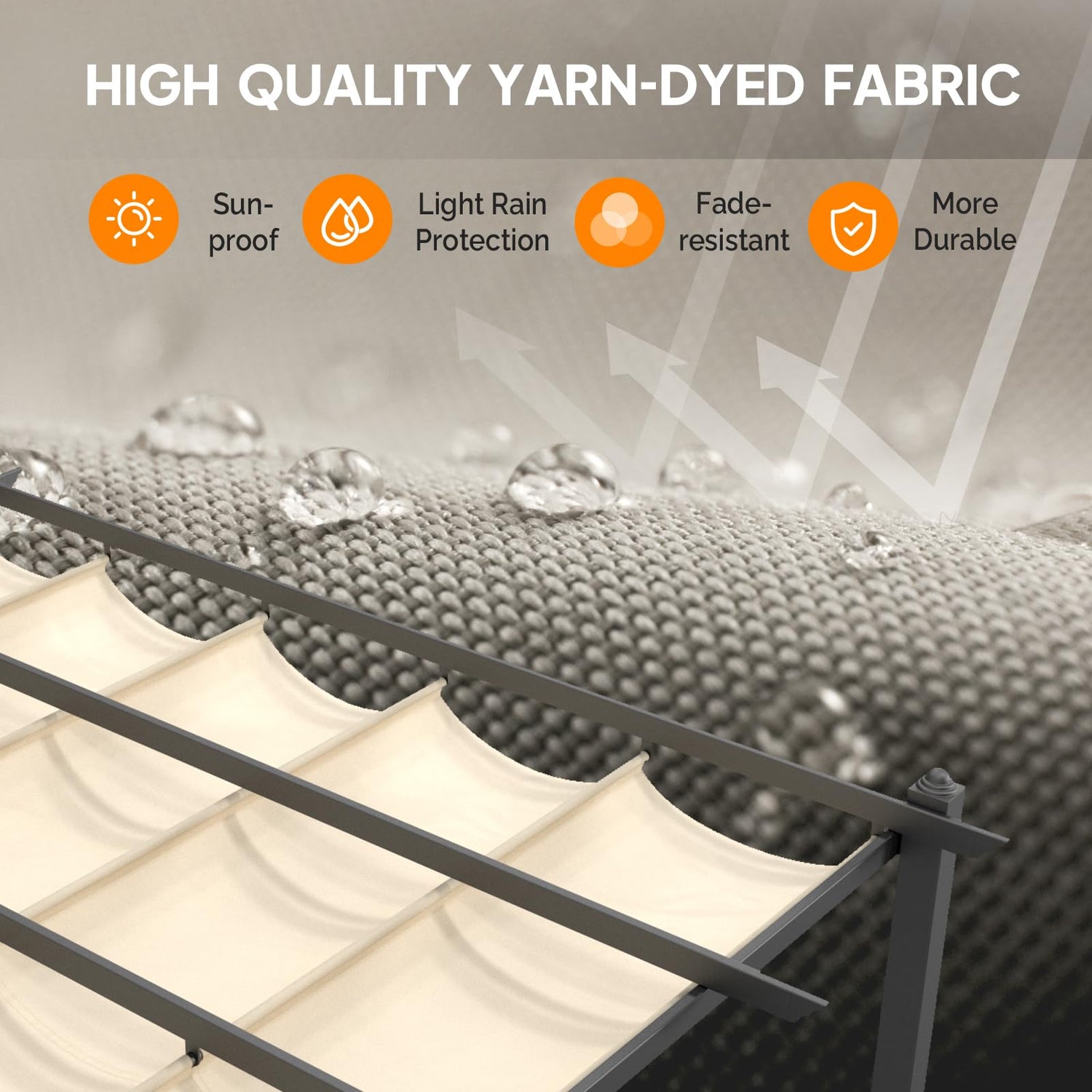 - Retractable Sun Shelter: The pergola 10'x10' is made of premium low-fade fabric that can protect you from sunlight and light rains. It features a retractable system that make you move the canopy exactly where you need it
