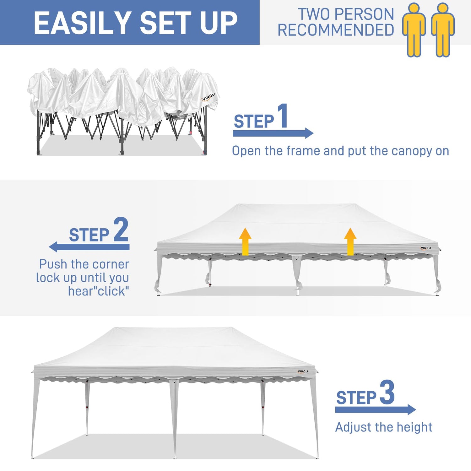 - Easy Setup and Takedown: Need 2-3 person to finish canopy tent 10x20 in few minutes. With no tools required.Take the fully assembled frame with top out of the bag, pull open, place the fabrics over the frame,extend the legs and you are done