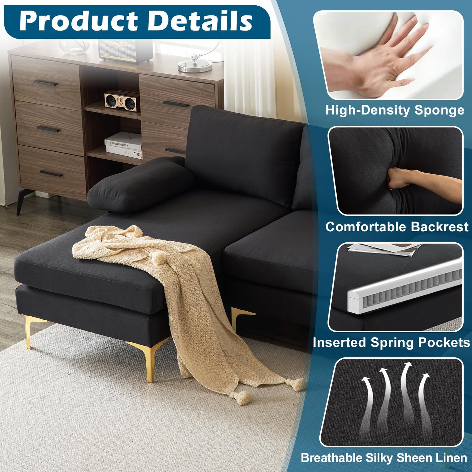 Specifications: Color:Black Material:Linen Fabric&Metal Legs Overall Dimensions:110"L × 51"W × 33.5"H Seat Length:94.5" Seat Depth:24.4" Seat Height:17.7" Chaise Length:46.9" Number of boxes:3 Package Dimensions per Box:51.6"L × 30.5"W × 6"H