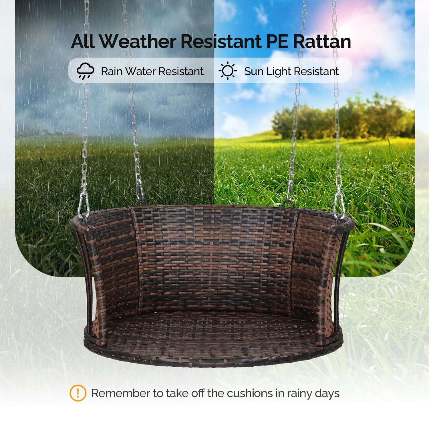 - All Weather PE Material - With the decent PE rattan, our front porch swing will perform perfectly in any weather conditions. Whether it’s sunny or rainy, the quality will never let you down