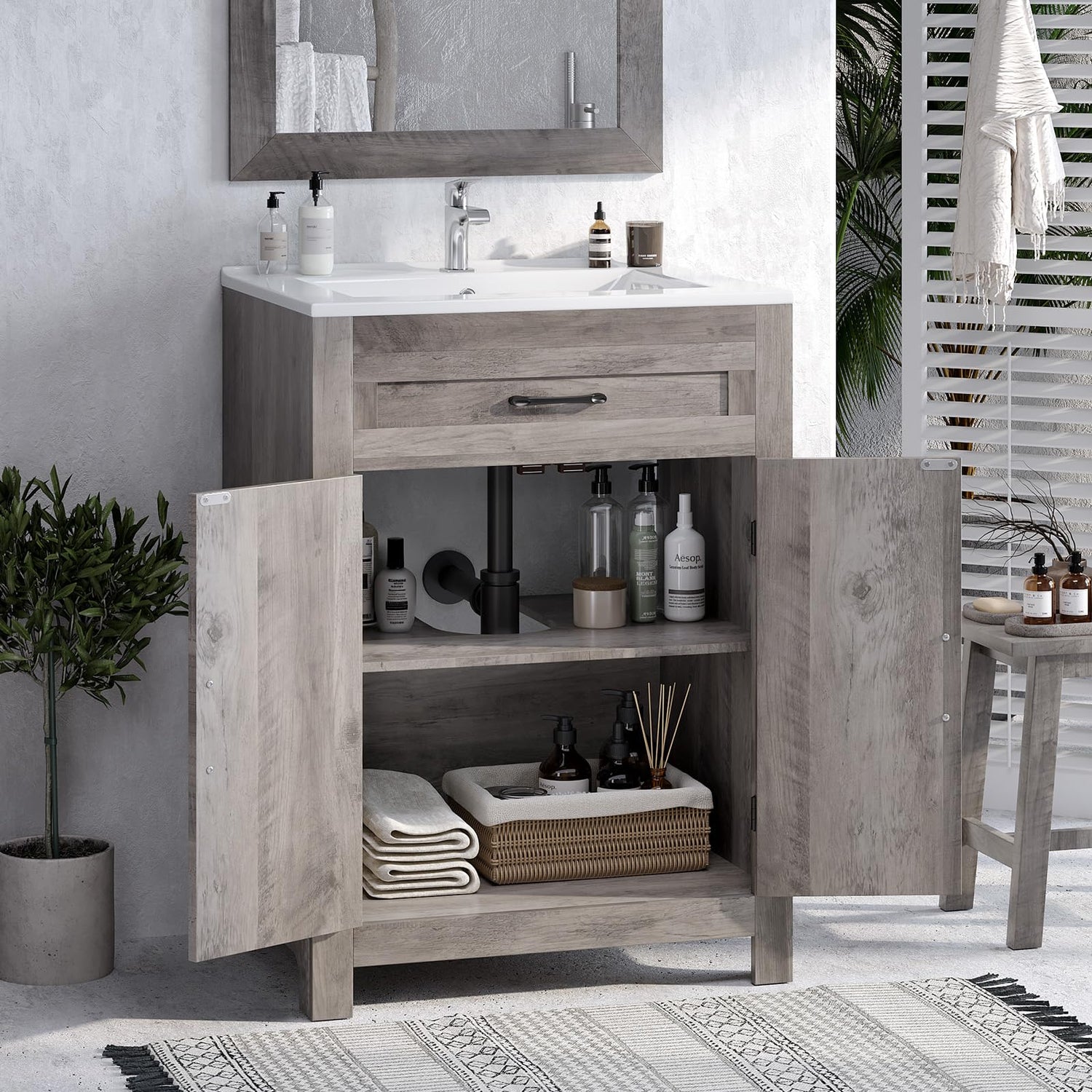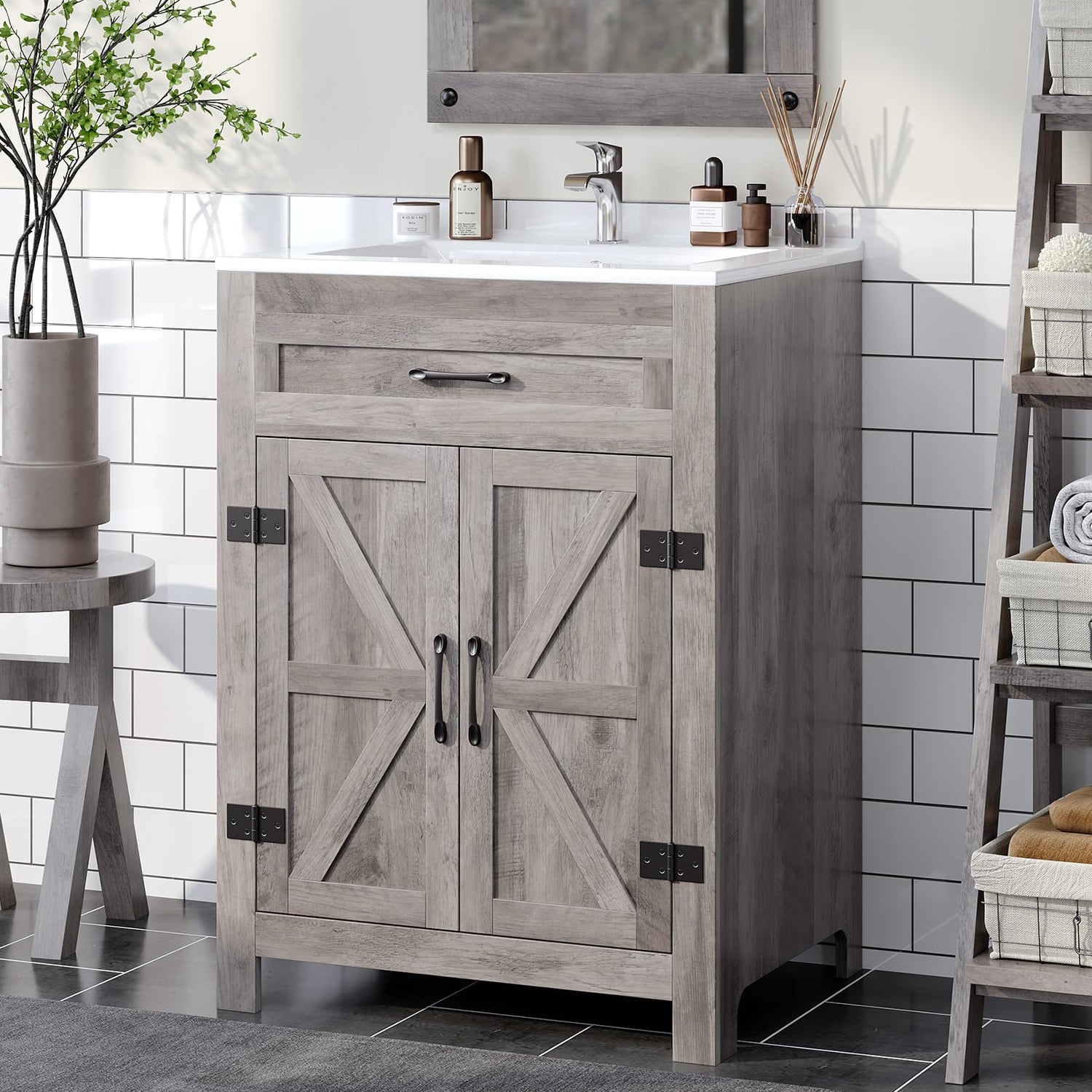 VINGLI 24" Farmhouse Bathroom Vanity with Sink, Undermount Vanity Sink Cabinet with Barn Door &Shelf,Free Standing Small Bathroom Storage Cabinet with Single Hole Ceramic Basin Combo Set,Washed Gray