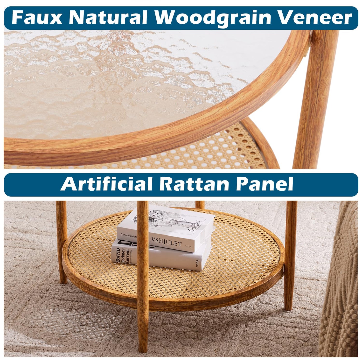 VINGLI 25.6" Rattan Coffee Table, Round Water-Wave Glass Metal Center Table, Modern Coffee Table with 2-Tier Storage, Farmhouse Circular Coffee Table for Living Room and Small Space, Natural Vibe