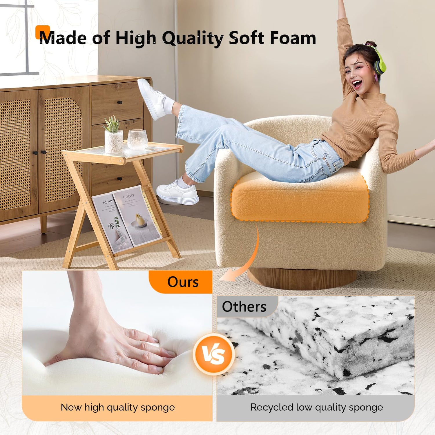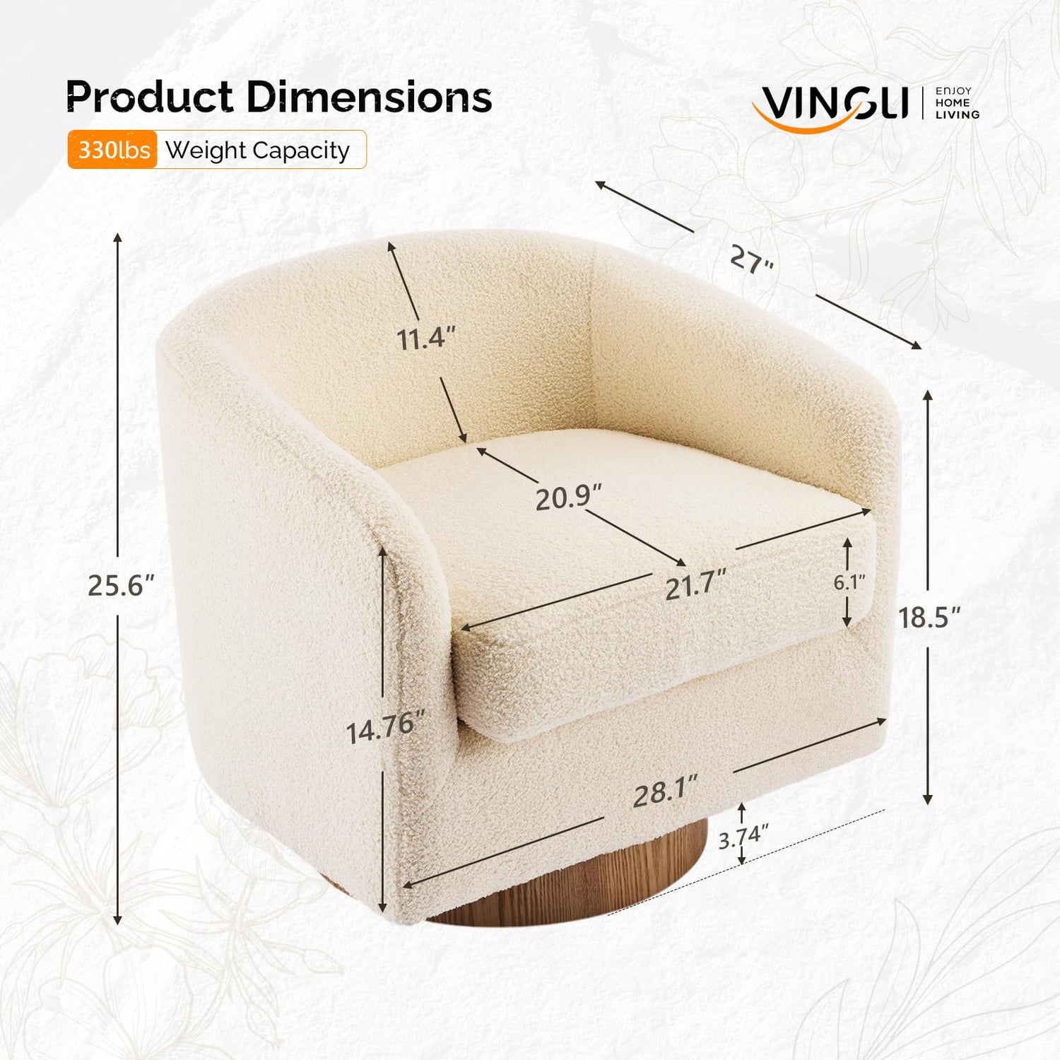- 【Structural Design】Our barrel chair features an ergonomic curved design that follows the natural contours of your body. The seat height is just right so you can relax and rest. The luxurious seat cushion is made of 6 inches of premium foam that is both incredibly soft and easily removable for easy maintenance. This exceptional blend of comfort and practicality makes our chair the perfect addition to any modern living space.The structure is sturdy with a maximum weight capacity of 330 pounds.