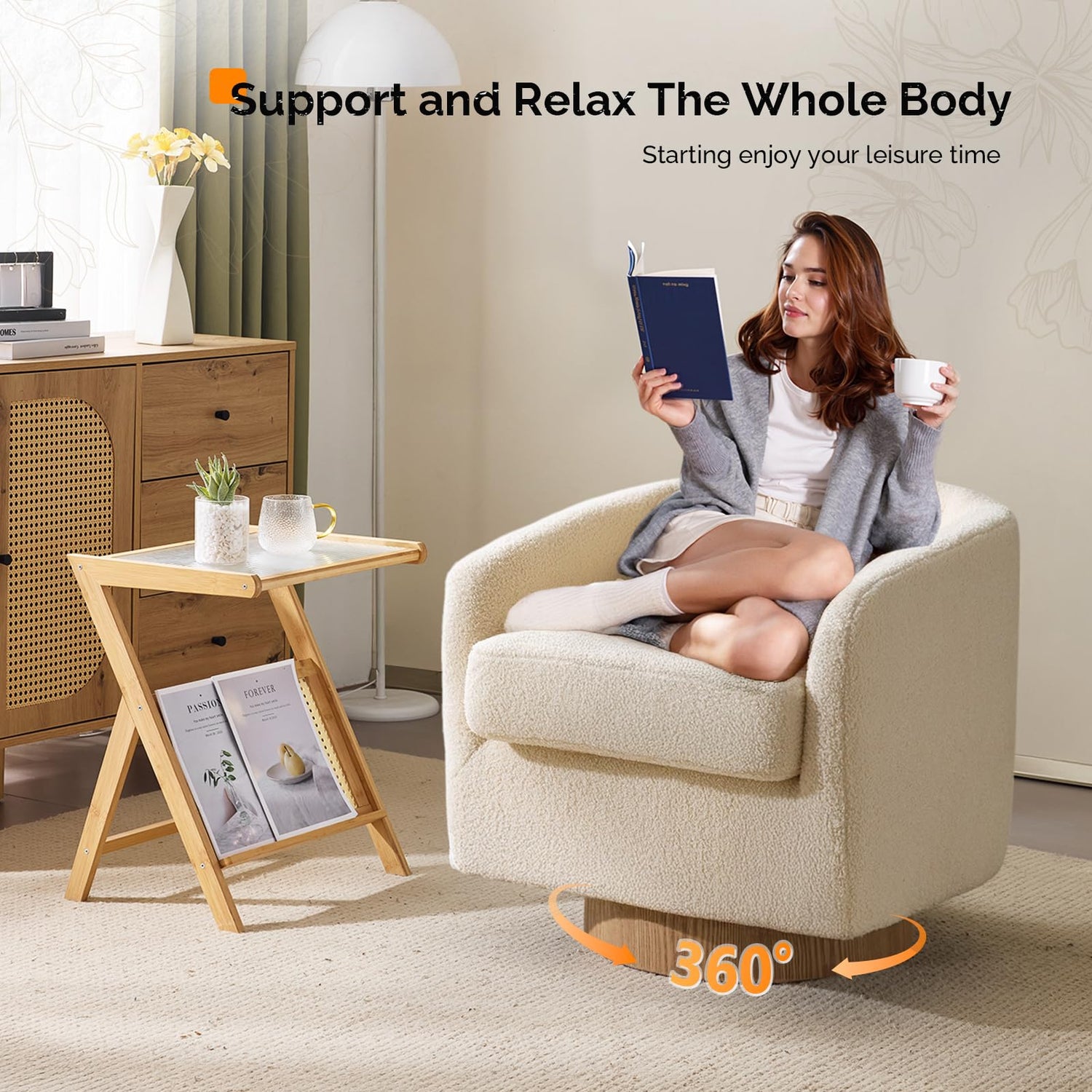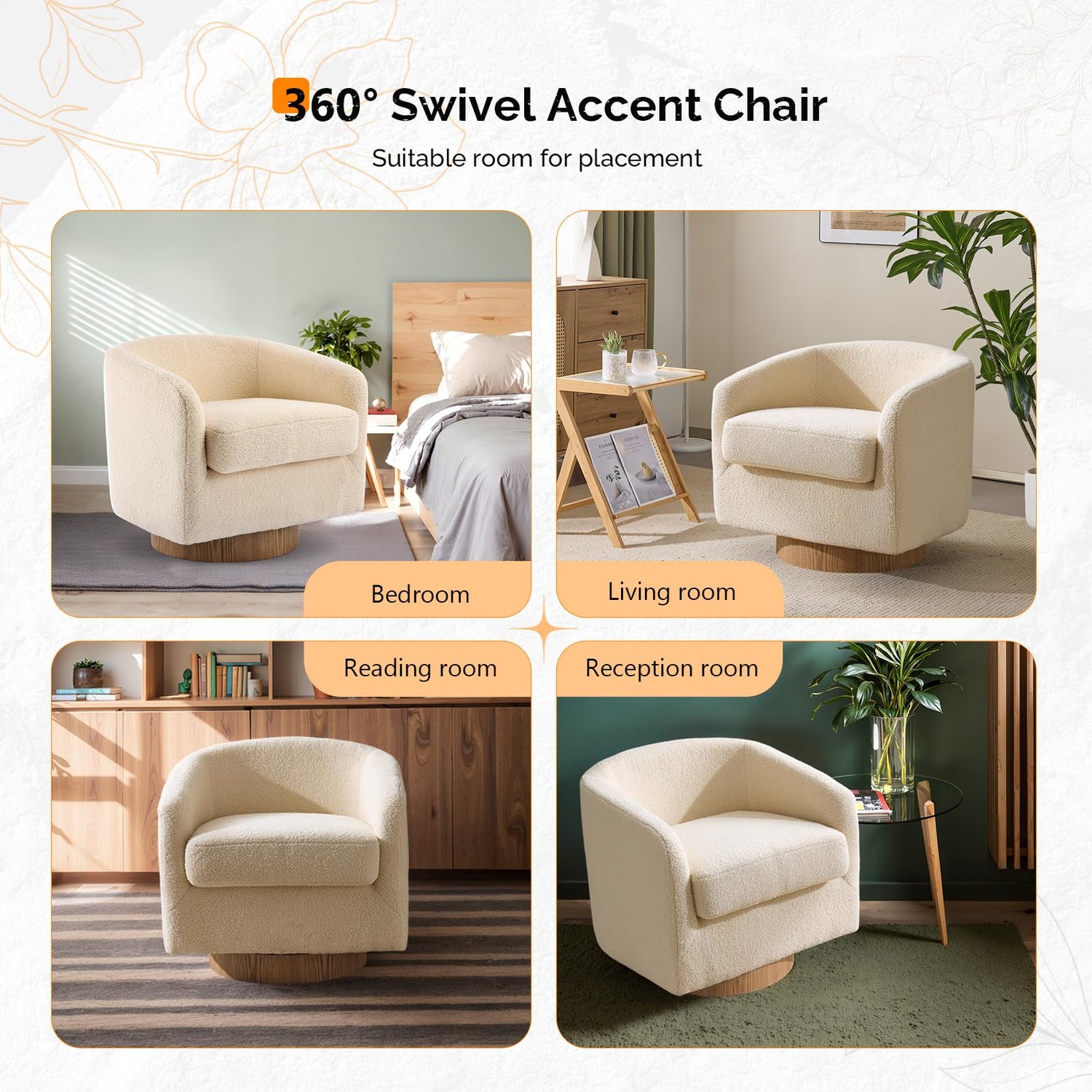 - 【Wooden Base and 360°Rotation】Experience luxurious 360° movement with our swivel accent chair featuring a turntable base. Perfect for your living room or entertainment space, this barrel chair offers effortless rotation while maintaining exceptional stability. The removable cushion provides superior comfort for extended relaxation, whether you're enjoying your favorite shows or simply unwinding after a long day.