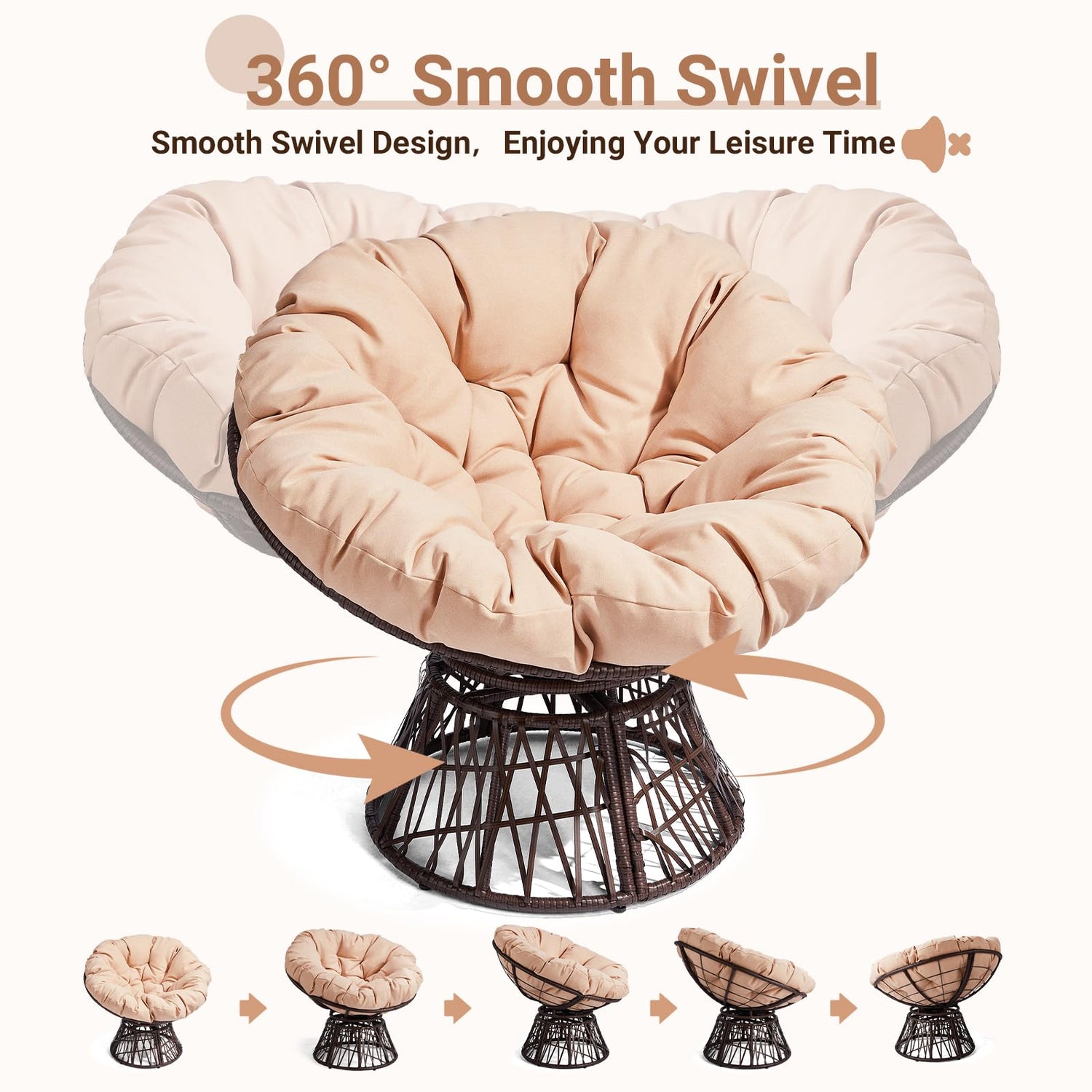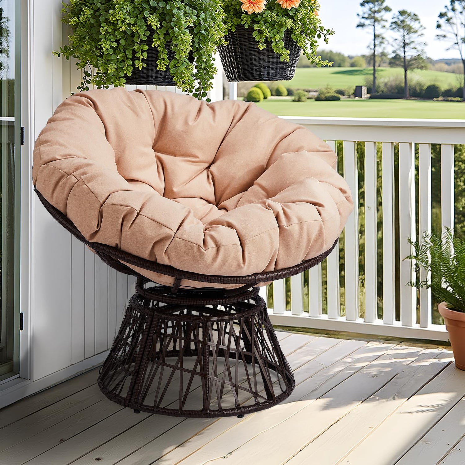 VINGLI 38” Outdoor Wicker Papasan Chair with Cushion, 360-Degree Swivel Egg Chair Patio Papasan Chairs Lounge Chair for Balcony, Yard, Porch (Brown)