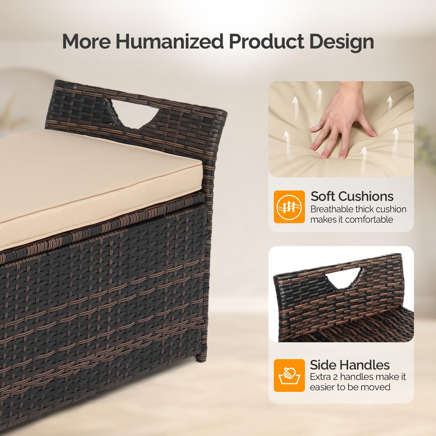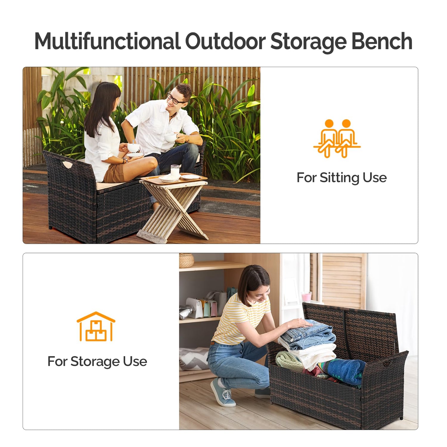 VINGLI 40 Gallon Outdoor Storage Bench with Cushion, Rattan Storage Box, Patio Wicker Deck Box with Seat for Garden | Balcony | Porch | Pool | Yard (Brown Frame + Beige Cushion)