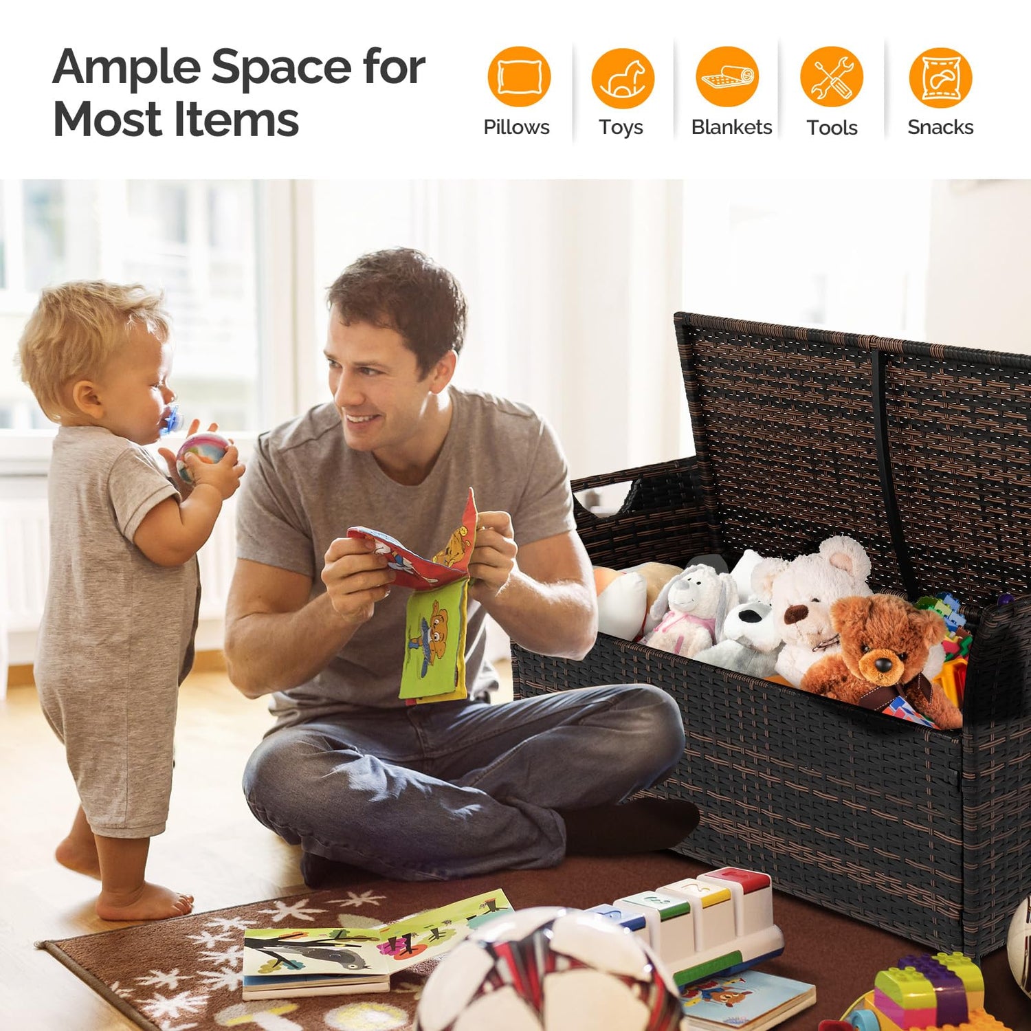 - 『Steel Frame & Exquisite Rattan』The frame of storage deck box is made of strong powder coated steel. And the frame is wrapped with premium PE rattan so that the box is weather resistant. That will definitely provide decent durability and stability