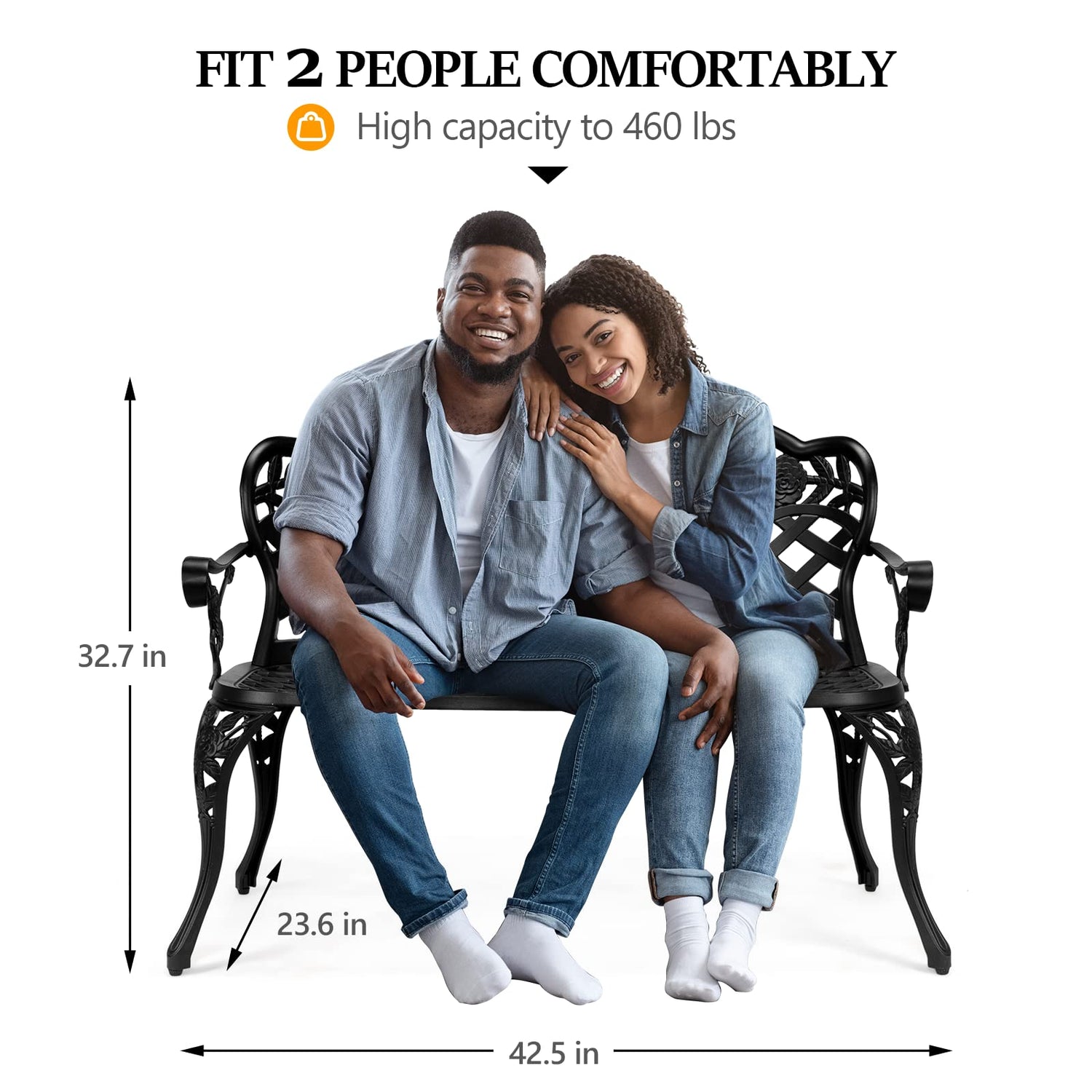 - Comfortable Seating: The outside iron benches feature a 42.5-inch seating surface with an ergonomically curved backrest that better conforms to the natural curve of your lower back. Accommodating 2-3 people, it's an excellent choice for driveways, backyards, or pathways, creating a cozy and free space for enjoying coffee or reading time with friends and family.