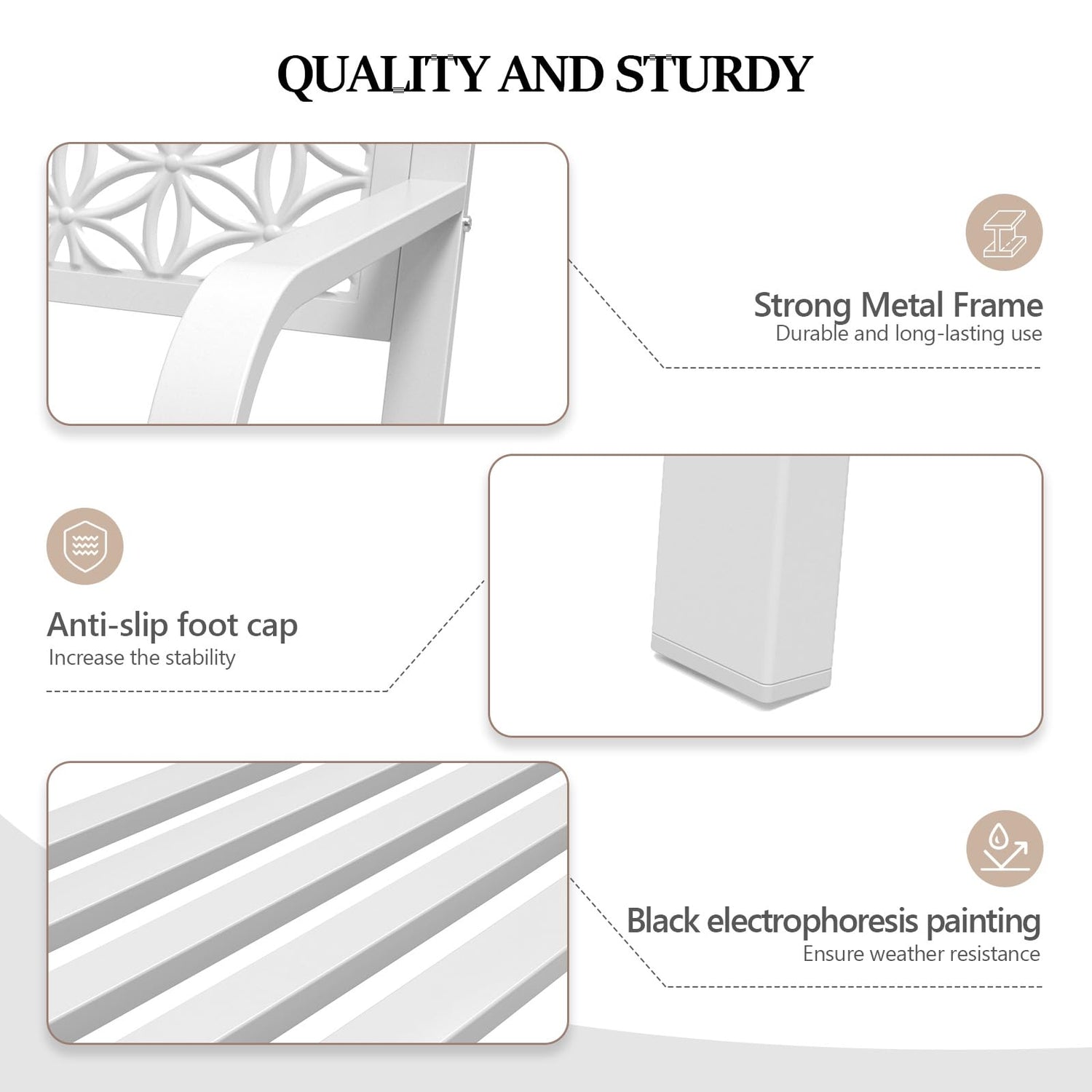 - Quality and Sturdy: The 50-inch metal outdoor bench is made from high-quality metal that is built to last. It is weather-resistant and can withstand the elements, making it the perfect choice for outdoor use. The legs are equipped with anti-slip foot caps make the bench more stable to use
