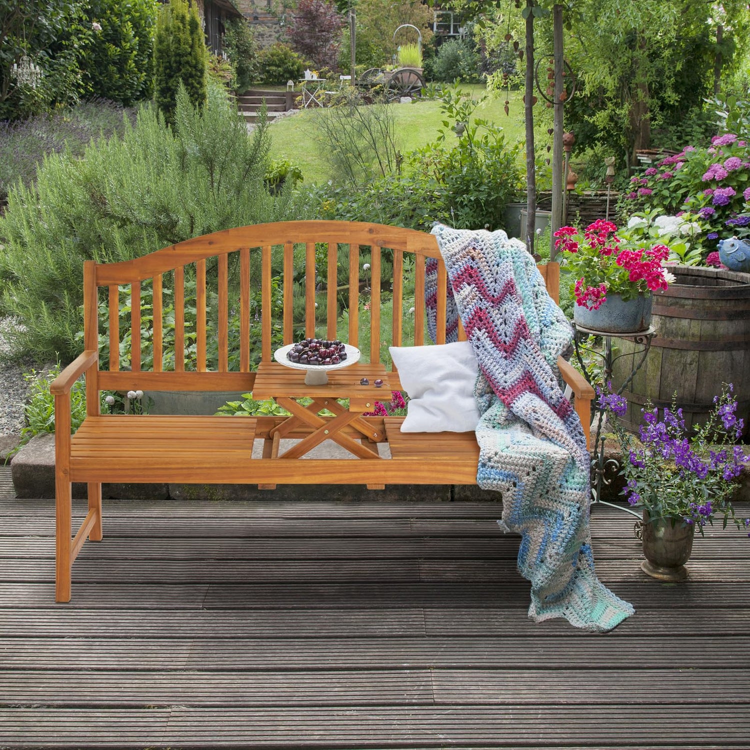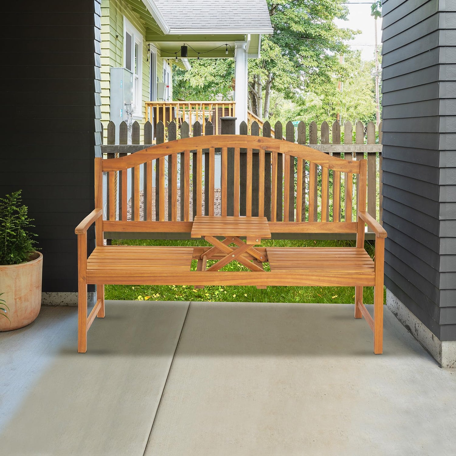 VINGLI 59” Outdoor Bench Garden Bench, Acacia Wood Porch Bench with Table, Wooden Patio Seating for Poolside Balcony Backyard
