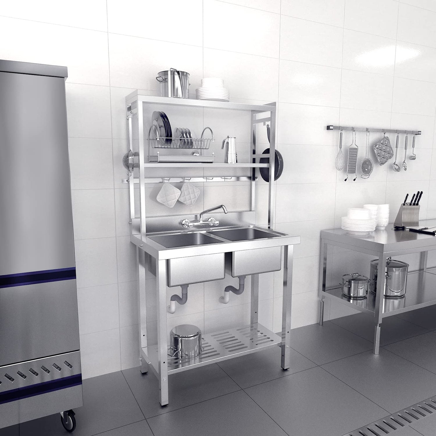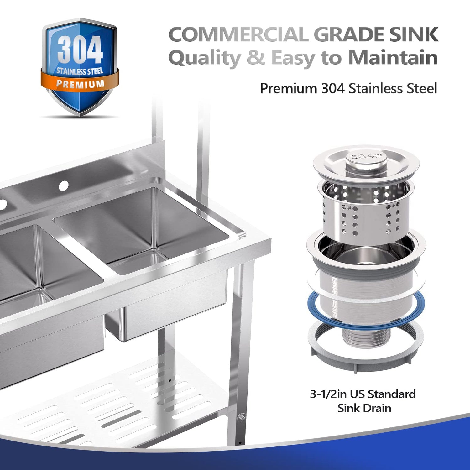 - 【COMMERCIAL GRADE】Crafted of premium commercial stainless steel, Vingli double basin sink with shelves has excellent corrosion resistance, oxidation resistance, and strength. Heavy duty 2 compartment sink freestanding is fantastic for commercial or domestic use such as restaurant, home kitchen, RV, garage, garden