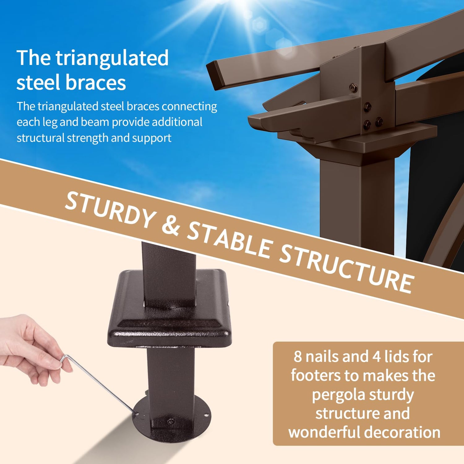 - [Stable and Secure]: The shade pergola with adjustable roof has been enhanced with reinforced posts for improved stability. We've included ground stakes to facilitate secure installation