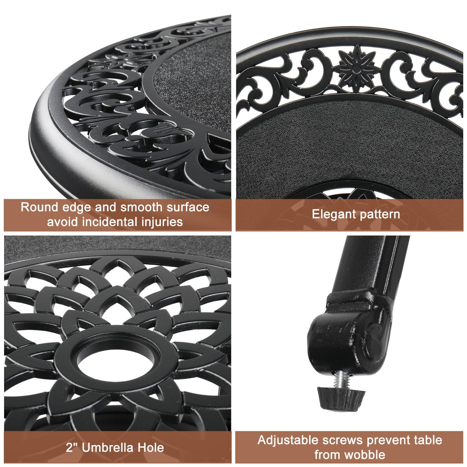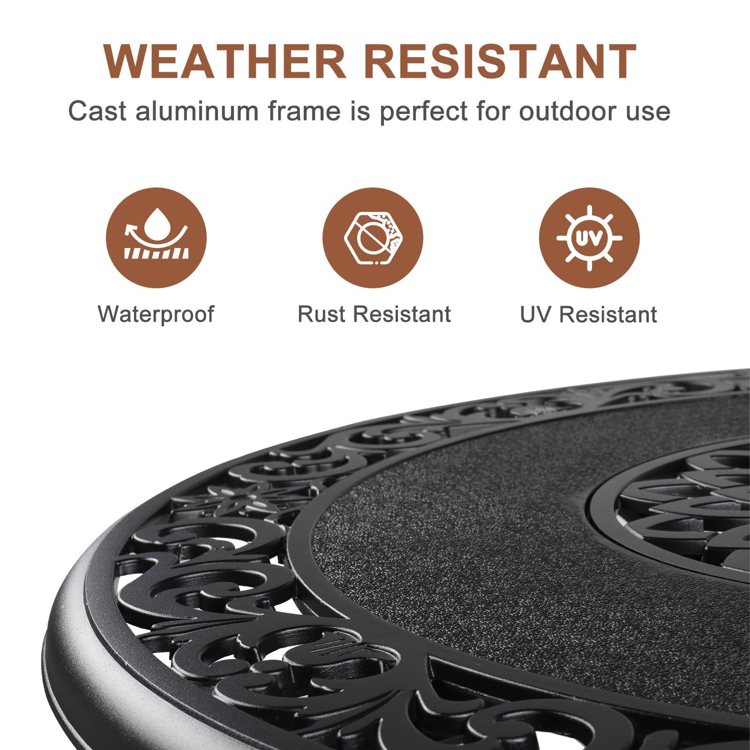 - [Sturdy patio table]: Our hard patio bistro table is made of cast aluminum, which is water-proof and all weather resistant. The frame is sturdy and the adjustable screw can prevent the dining table from leaning