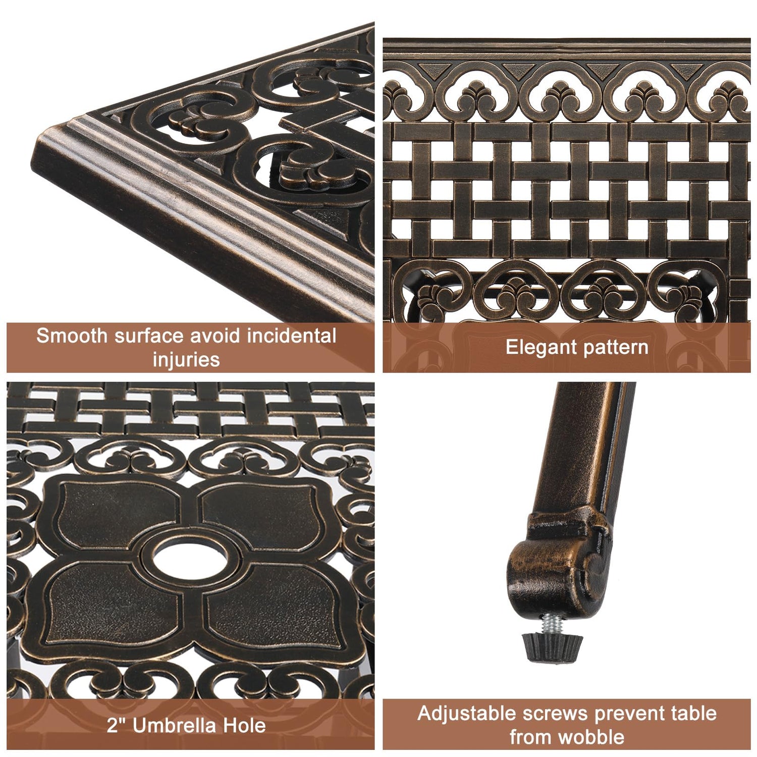 - [Sturdy patio table]: Our hard patio bistro table is made of cast aluminum, which is water-proof and all weather resistant. The frame is sturdy and the adjustable screw can prevent the dining table from leaning