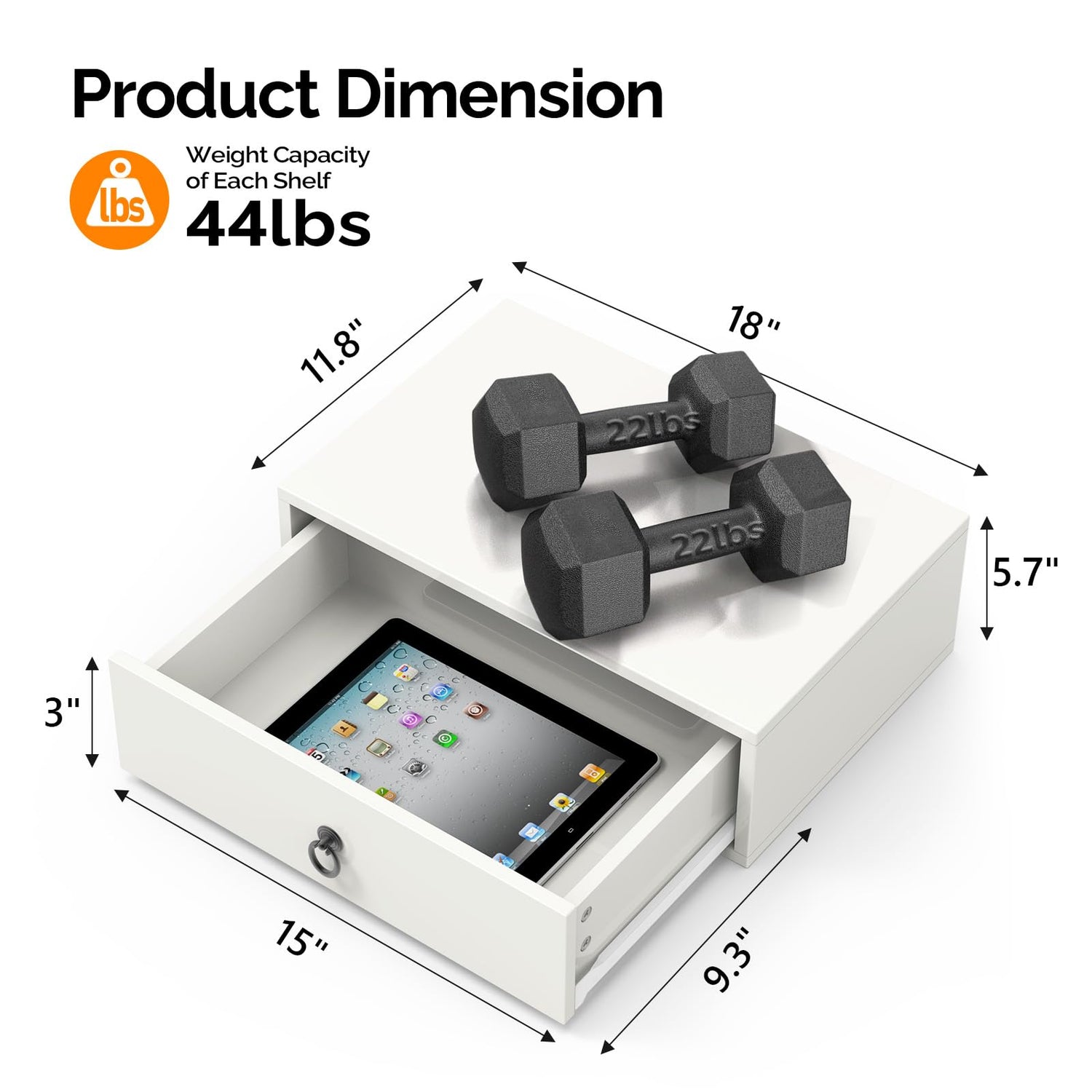 - 【Space-saving Design】The wall nightstand frees up and maximizes floor space, making it ideal for small bedrooms or rooms with limited space. The overall size is 18"W x 11.8"D x 5.9" H, with a drawer inner size of 10"W x 8"D x 3"H, offering ample storage space for organizing essential items like books, eyeglasses, or personal belongings conveniently within reach.