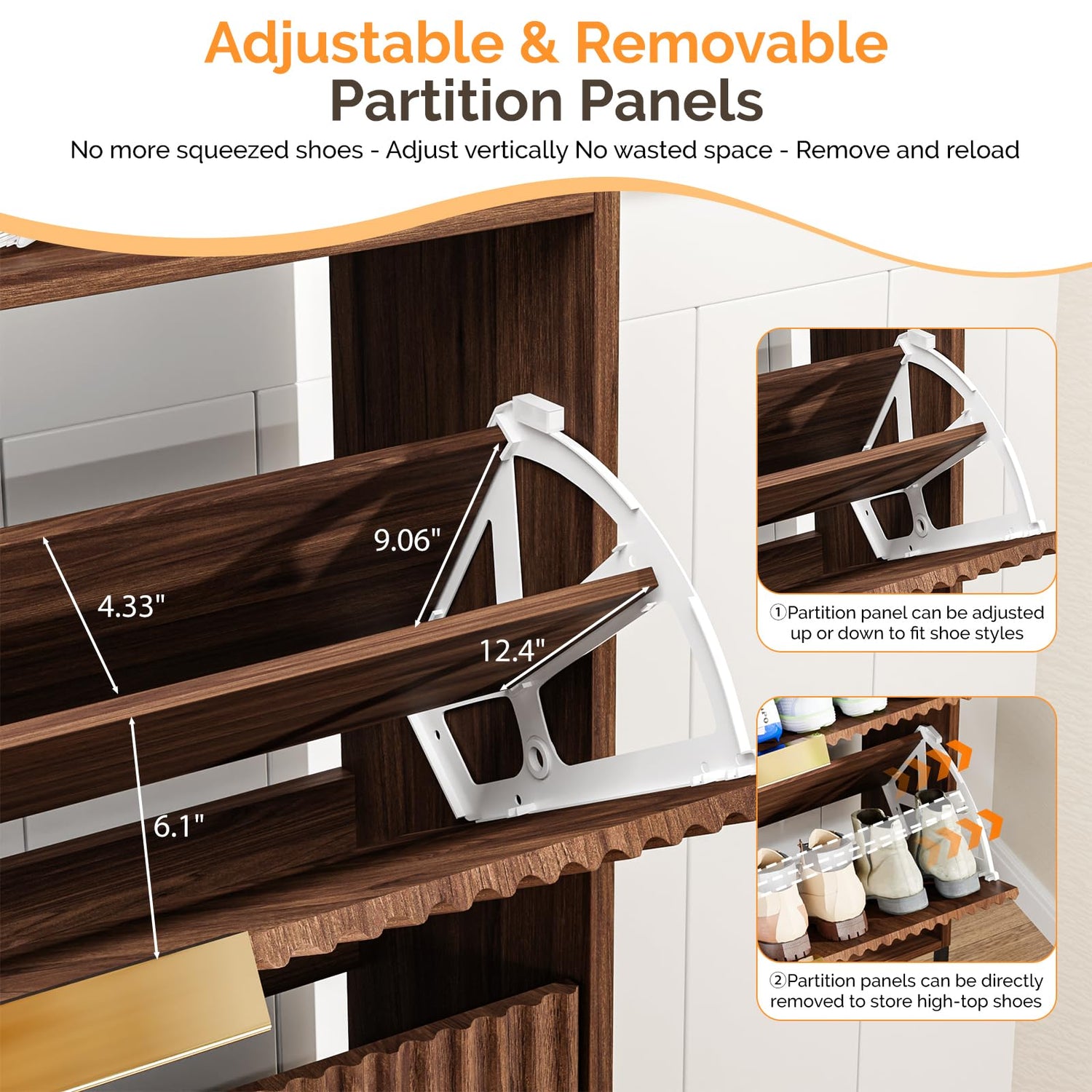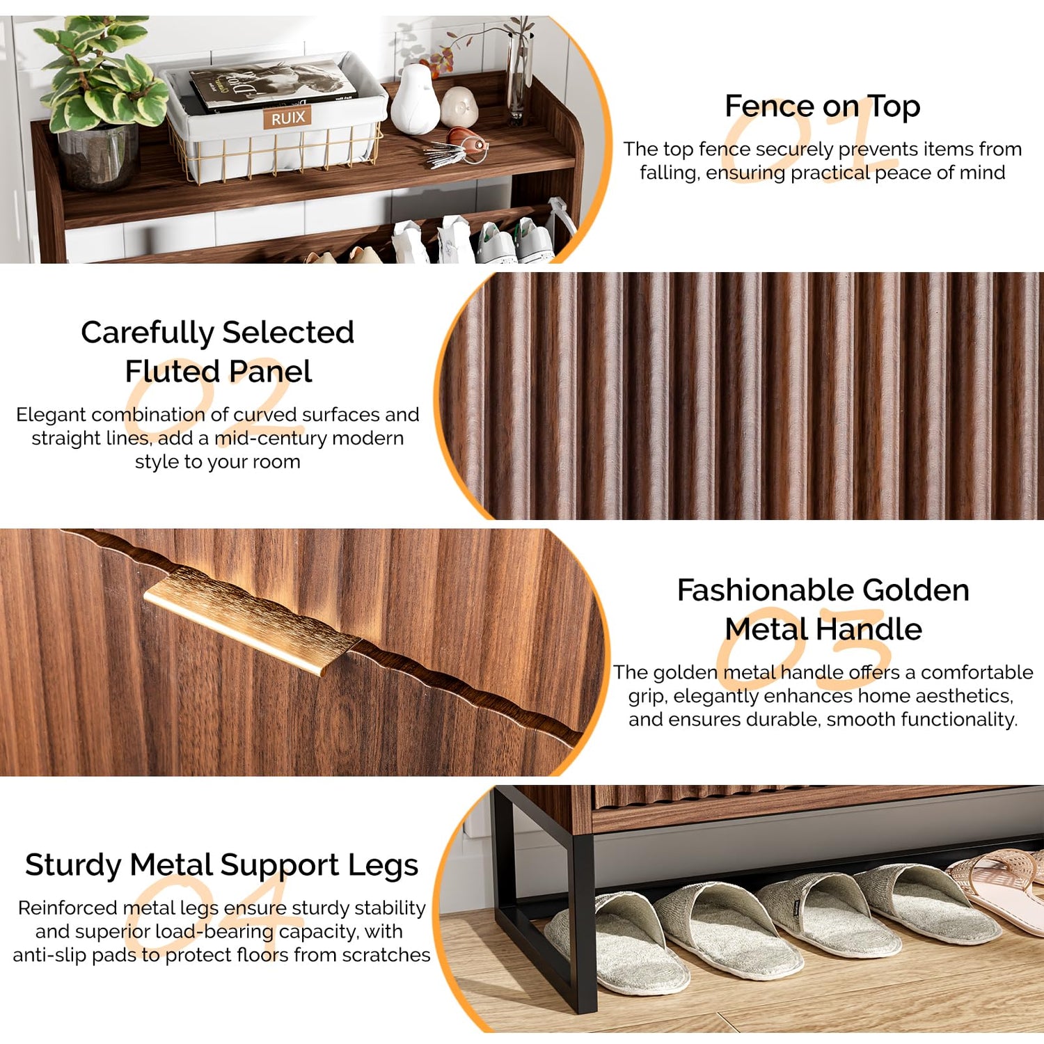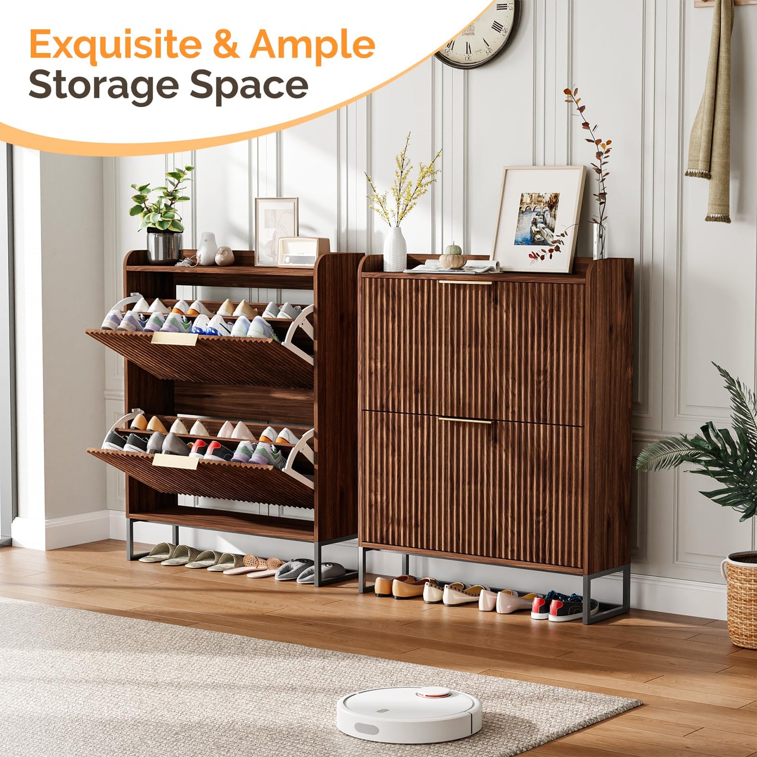 VINGLI Fluted Shoe Cabinet Storage for Entryway,Hidden Shoes Storage Cabinet with 2 Flip Drawers, Mid Century Modern Shoe Rack Organizer,Free Standing Shoes Organizer for Hallway(Dark Walnut)
