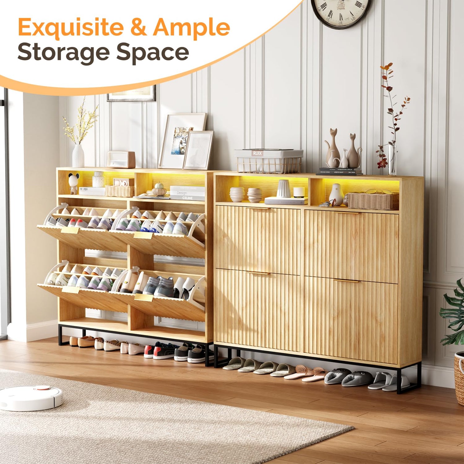 VINGLI Fluted Shoe Cabinet Storage for Entryway,Hidden Shoes Storage Cabinet with 4 Flip Drawers, Mid Century Modern Shoe Rack with LED Light,Shoes Organizer with Cubby for Hallway(Natural Oak)