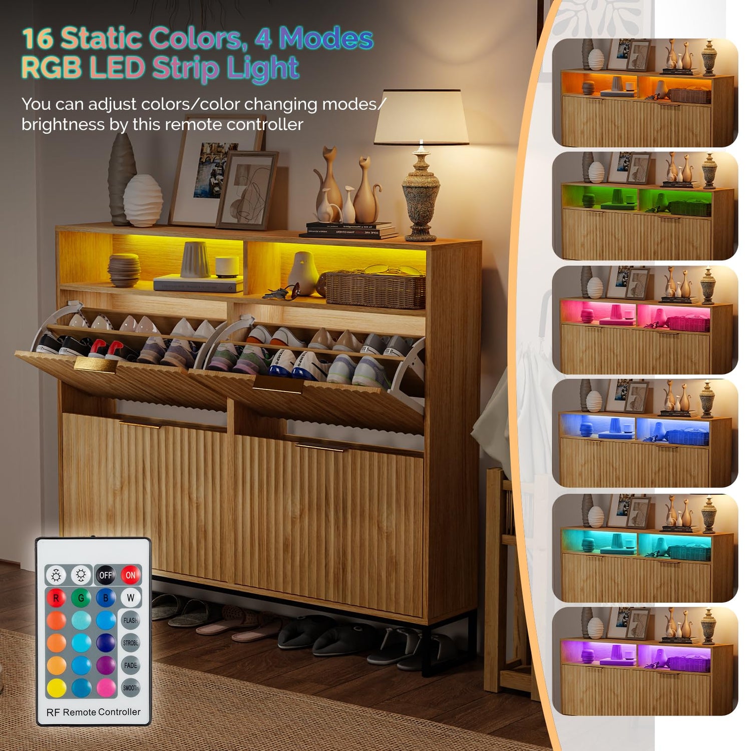 • Versatile Functionality & Easy Assembly: Besides shoe storage, the 2 open shelves above the 4 flip drawers, with an installed RGB LED Strip Light (adjustable with a 24 - key Remote Controller), are great for displaying decor or practical items. The cabinet top can also be used for additional storage. Plus, it comes with easy - to - follow assembly instructions for a hassle - free setup.