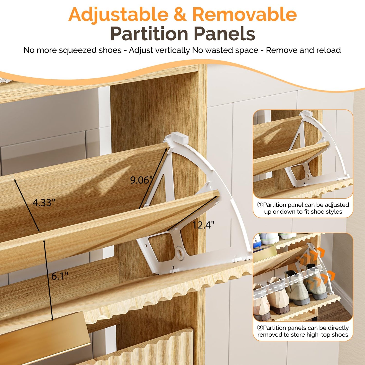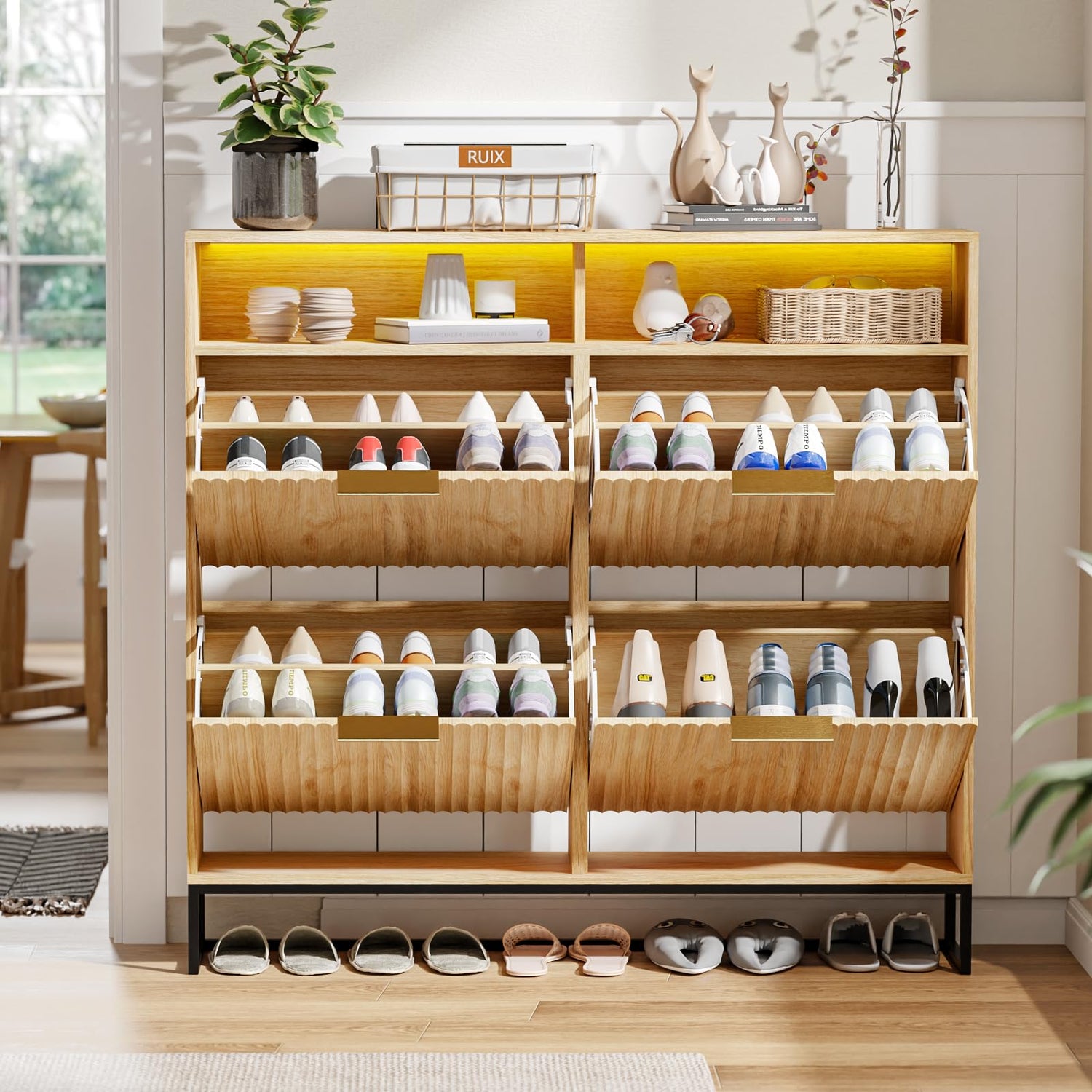 • Hidden Storage with 4 Fluted Flip Drawers and Metal Support Feet: Equipped with 4 flip drawers, this shoe cabinet provides hidden storage for your shoes. The drawers come with adjustable and removable partition panels, accommodating different shoe styles. The metal support feet enhance stability and contribute to a total capacity of up to 34 - 38 pairs of shoes.