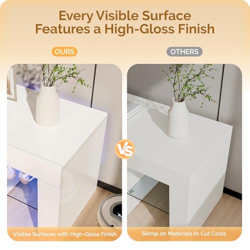 - 【LED Lights】The mid century modern tv stand with the slick White design and glossy finish, features 2 glass shelves and LED lights system, will make your entertainment life more dynamic, can also be used as a night light
