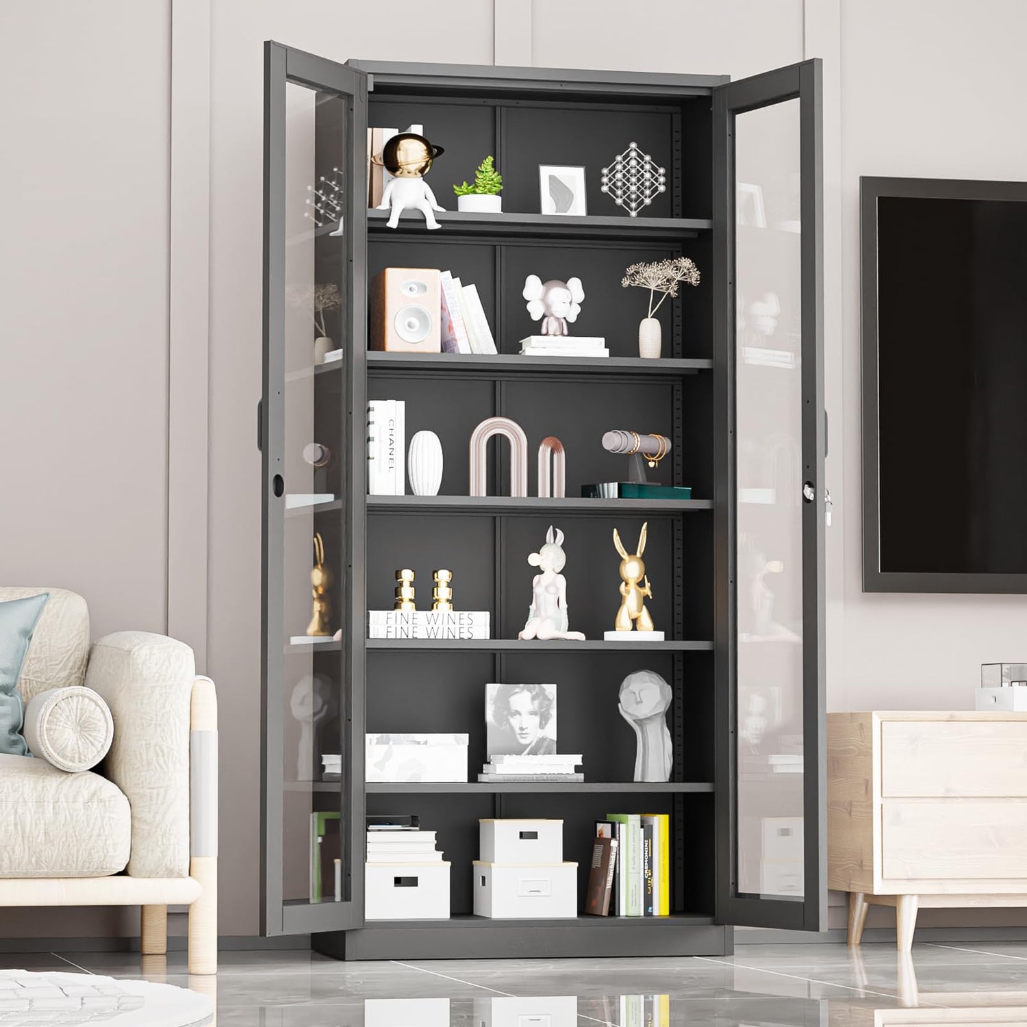 Details: The VINGLI Metal Display Cabinet with Glass Doors is the ultimate solution for stylish and secure storage. Featuring 5 adjustable shelves, this metal display cabinet offers flexibility for organizing books, collectibles, or office essentials. The upgraded tempered glass doors ensure high visibility and protection, while the sturdy all-steel construction supports up to 120 pounds per shelf. A secure three-point locking system provides peace of mind for valuable items. Ideal for home, office, clinic, or retail spaces, this cabinet combines functionality with an elegant design. Easy to assemble with support from our customer service, it's the perfect addition to any space.