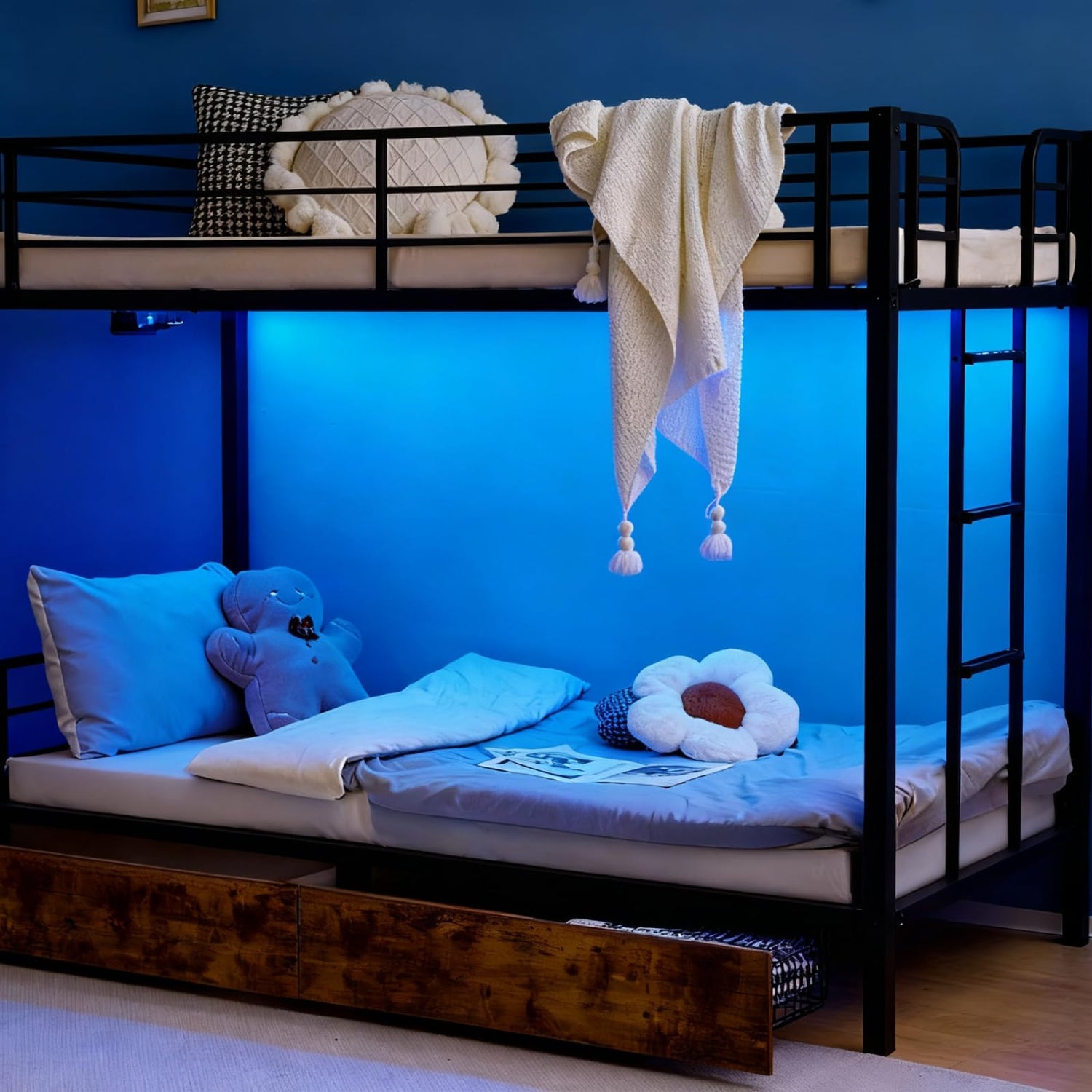VINGLI Metal Bunk Bed Frame Twin Over Twin with 2 Drawers, LED Lights, Non-Slip Ladder, Full Length Guardrail, Charging Station, for Kids, Teens & Adults, Space-Saving, No Box Spring Needed, Black