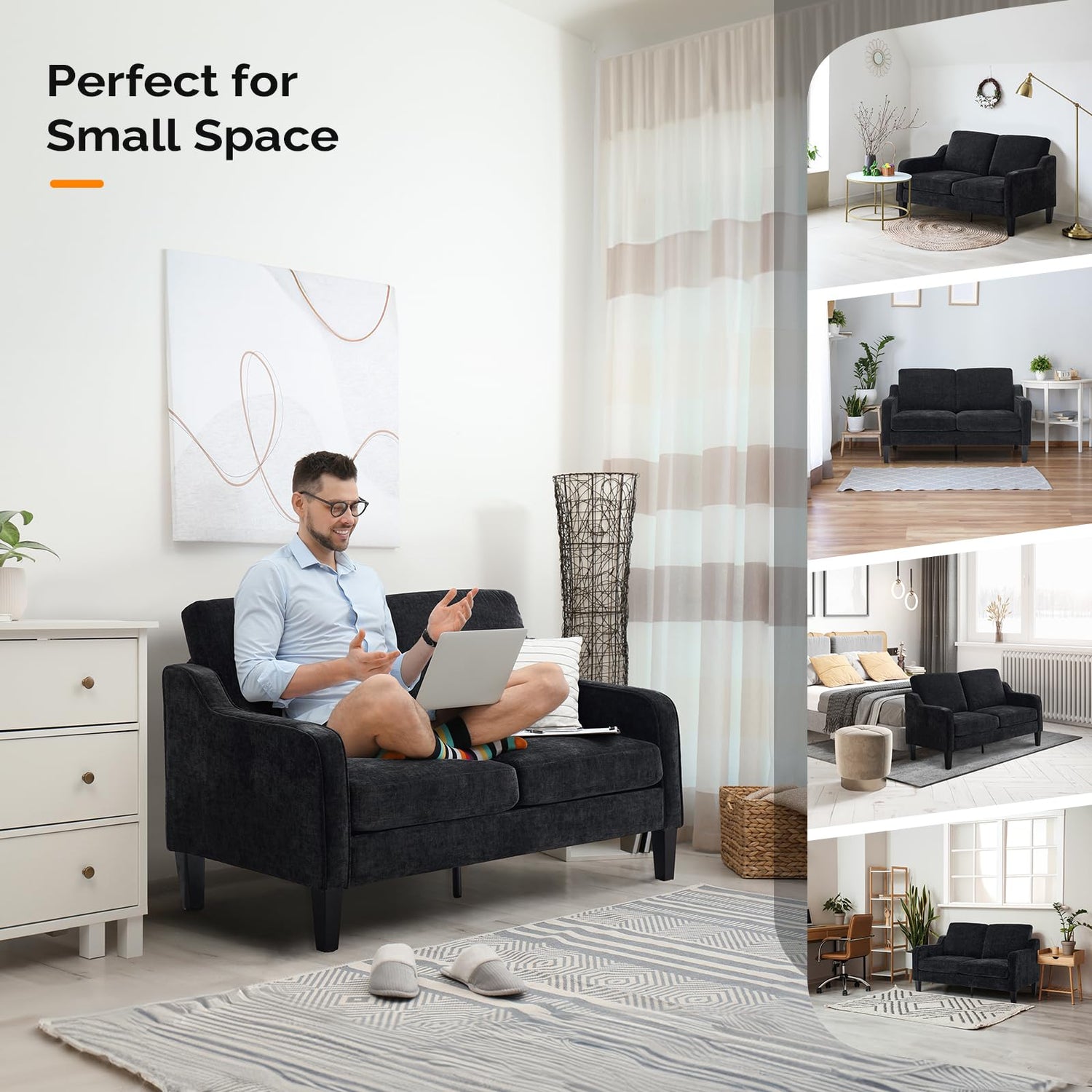 VINGLI Mid-Century Modern Loveseat Sofa Couch, Living Room 53" Love Seat 2 Seater Upholstered Comfy Couches with Scooped Armrest for Small Spaces, Dorm, Bedroom, Apartment, Office (Black)