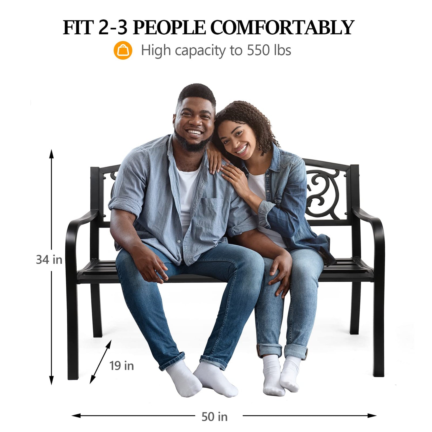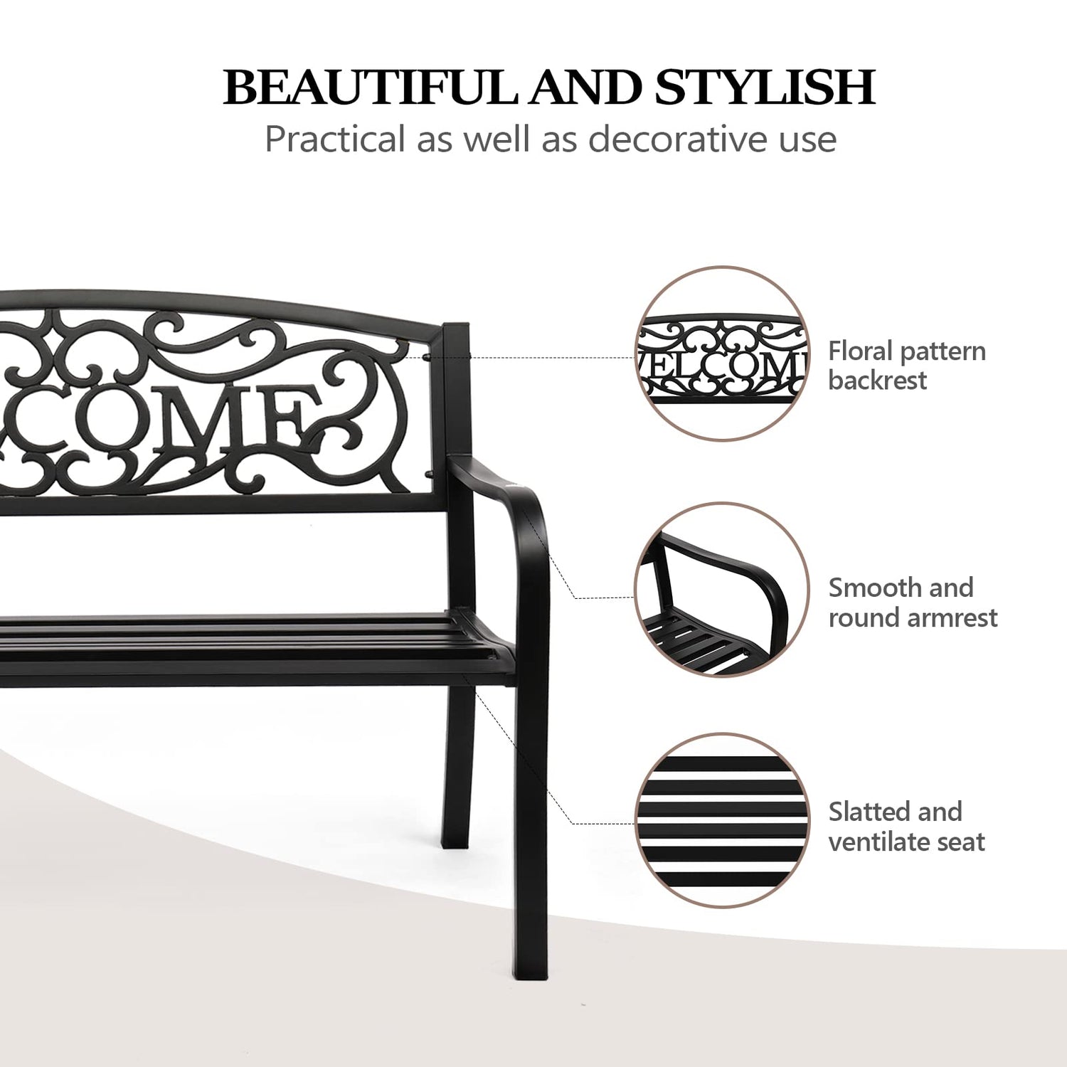 VINGLI Outdoor Bench with PVC Back Pattern, Metal Garden Bench Black Steel Welcome Bench for Patio, Porch, Deck, Yard, Lawn Decor Entryway