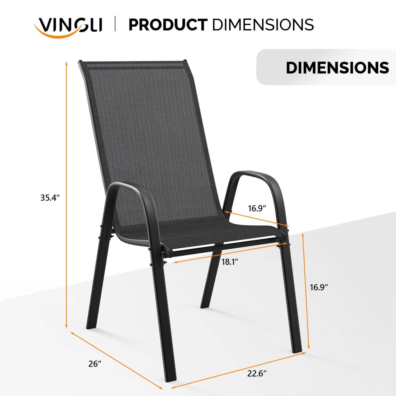 Details: VINGLI 4-Piece Stackable Outdoor Chairs - Space-Saving Sling Back Design with Armrests for Pool, Deck, Garden (Black)