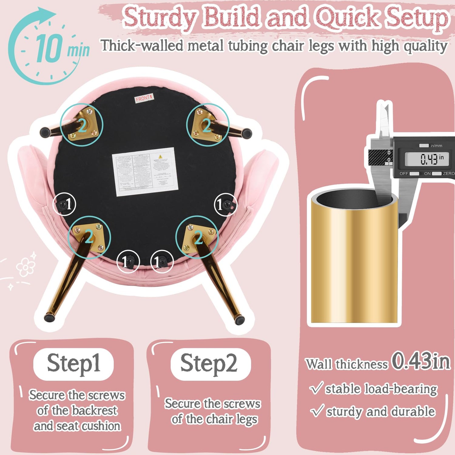 - 4. Sturdy Structure & Adjustable Feet: Elegant gold legs and solid wood frame panels provide stability and support, while adjustable foot pegs allow you to adjust for varying floor levels, making this cute desk chair a versatile addition to your home office or vanity station.