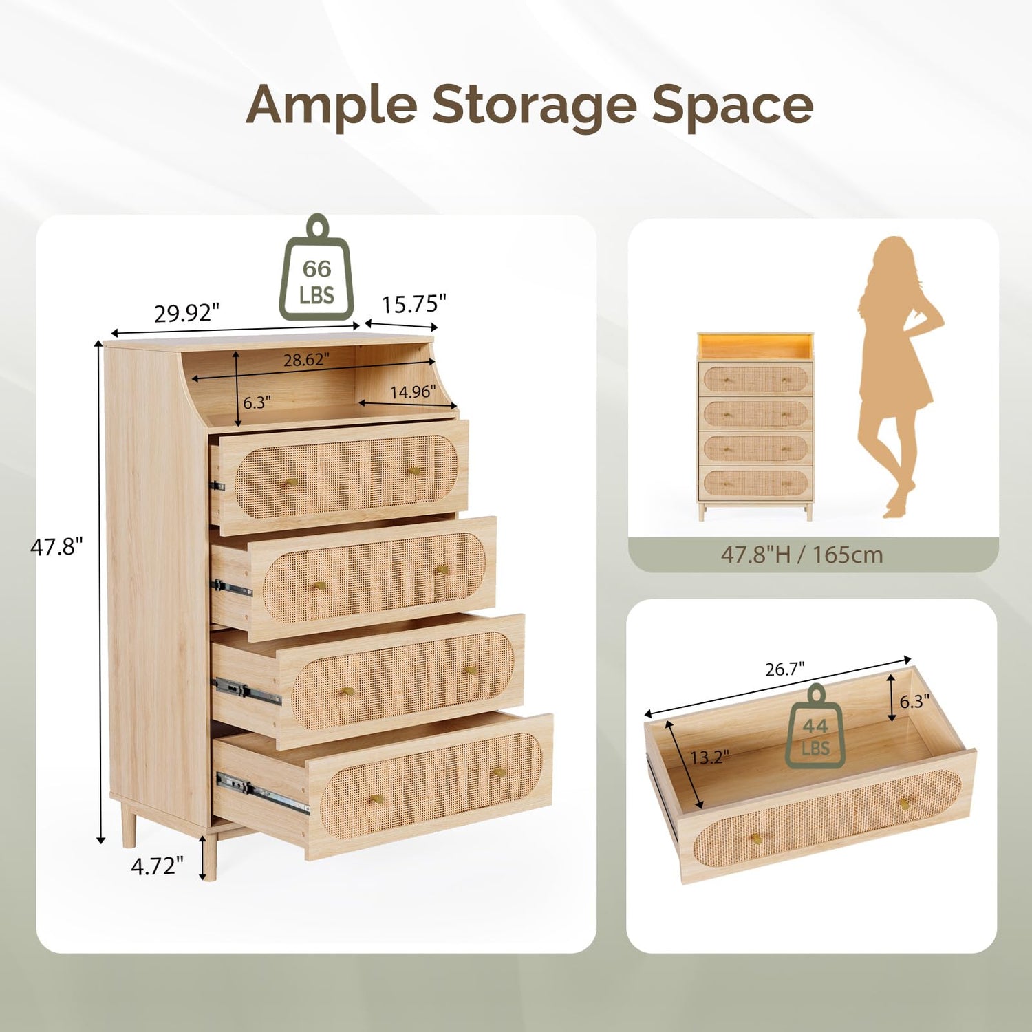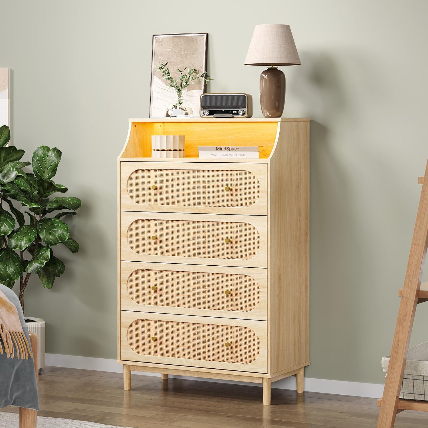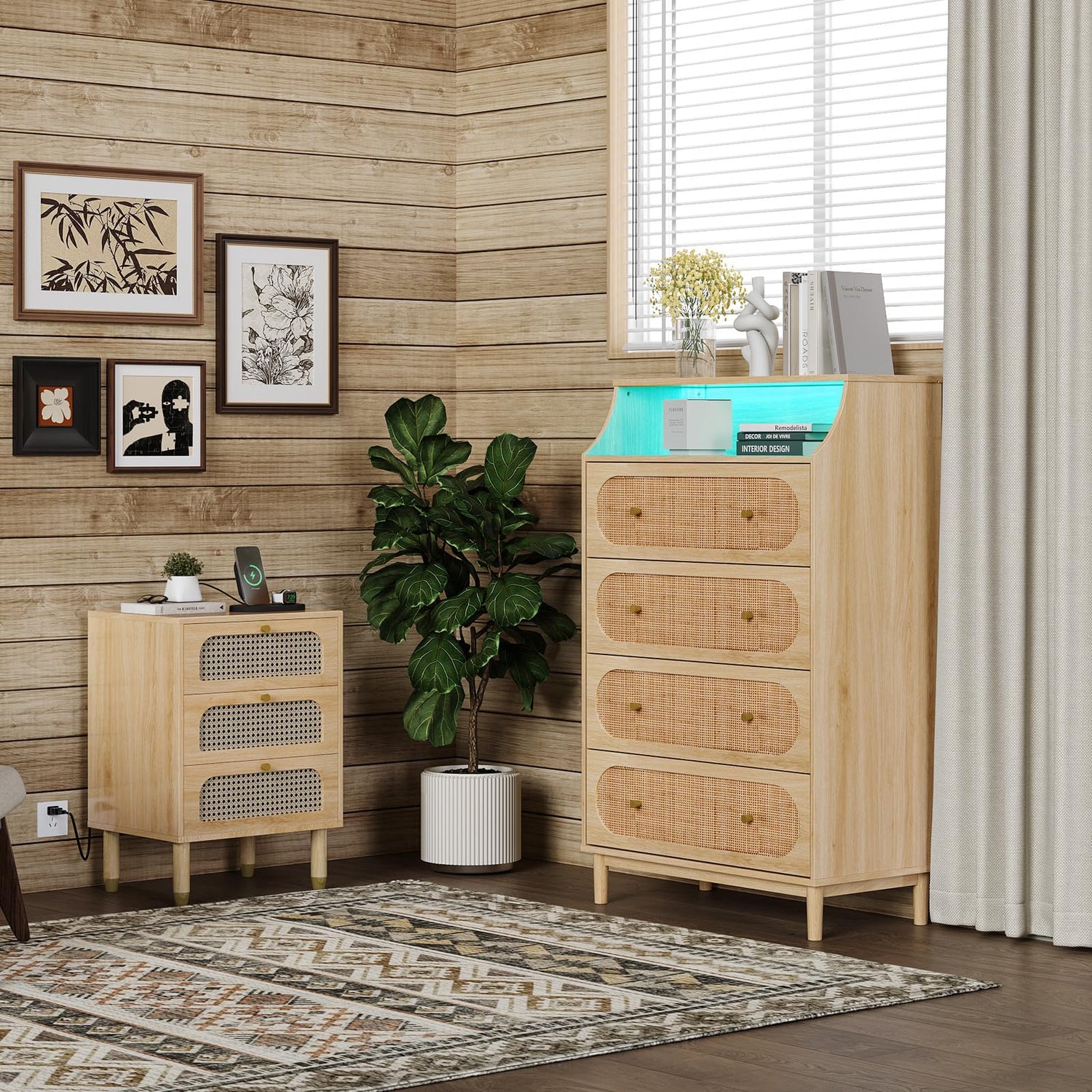 VINGLI Rattan Dresser with LED Lights, Tall Dresser Boho Chest of Drawers for Bedroom, Wicker Chest 4 Drawer, Vertical Dressers for Bedroom,Natural Oak