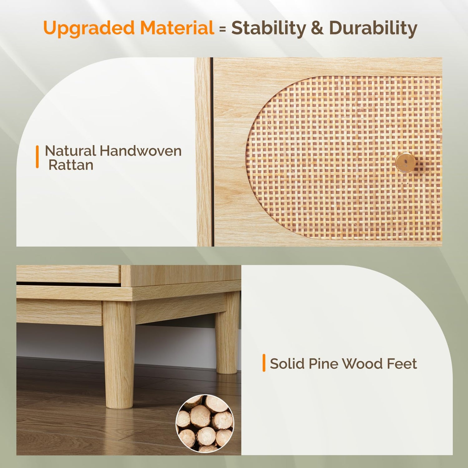 - 【Real Rattan & Pine Wood Leg】Constructed of natural handwoven rattan, robust pine wood feet, durable engineered wood and the water-proof finish, there is no need to worry that the scraches or water will damage your nightstand. The premium materials combines aesthetic appeal with practicality, offering a long-lasting and visually pleasing addition to your bedroom or living space.