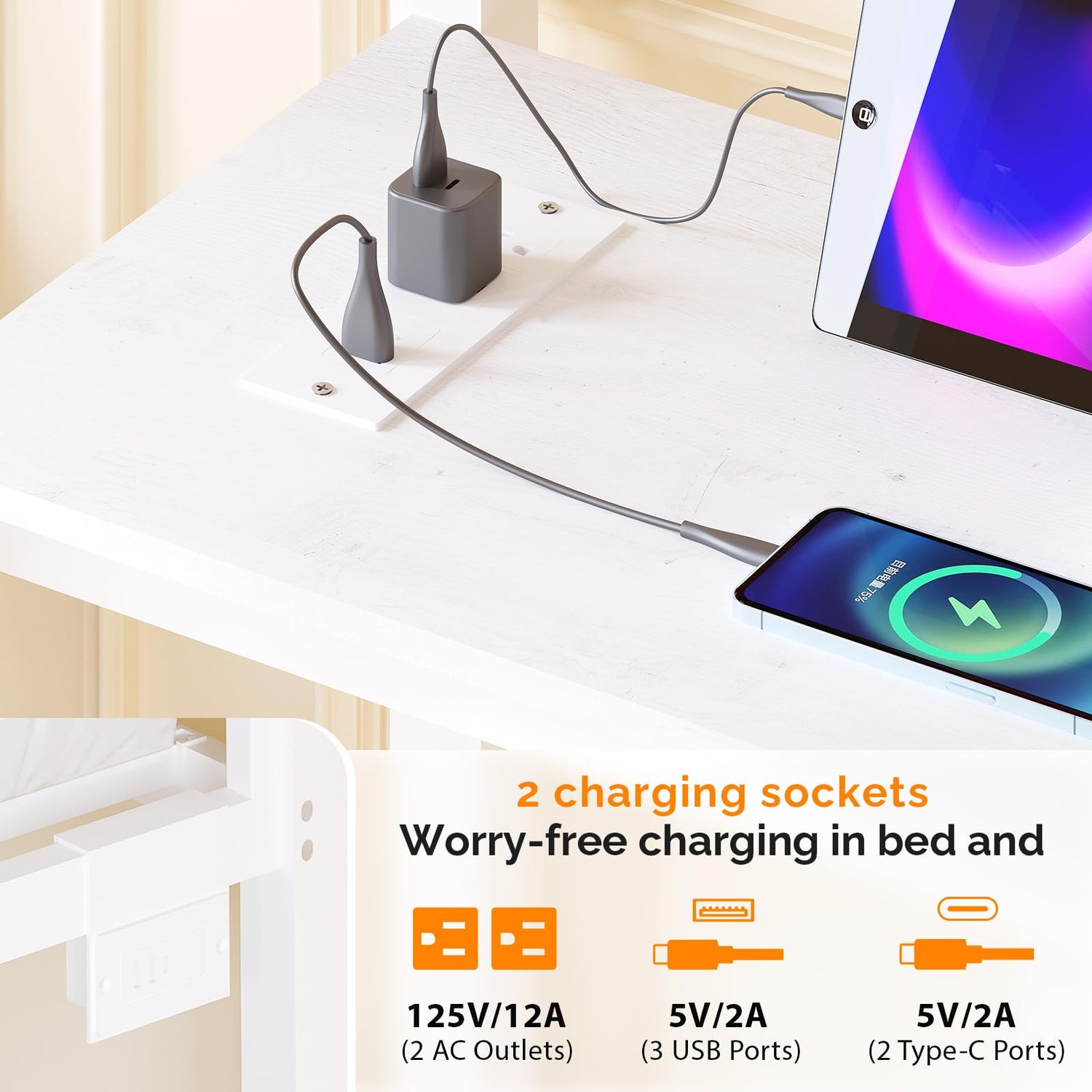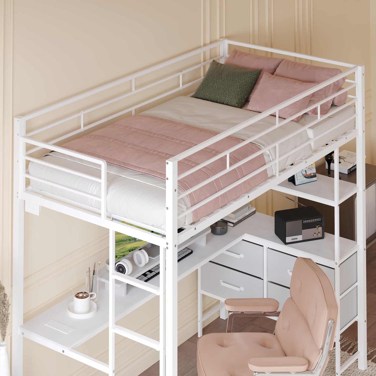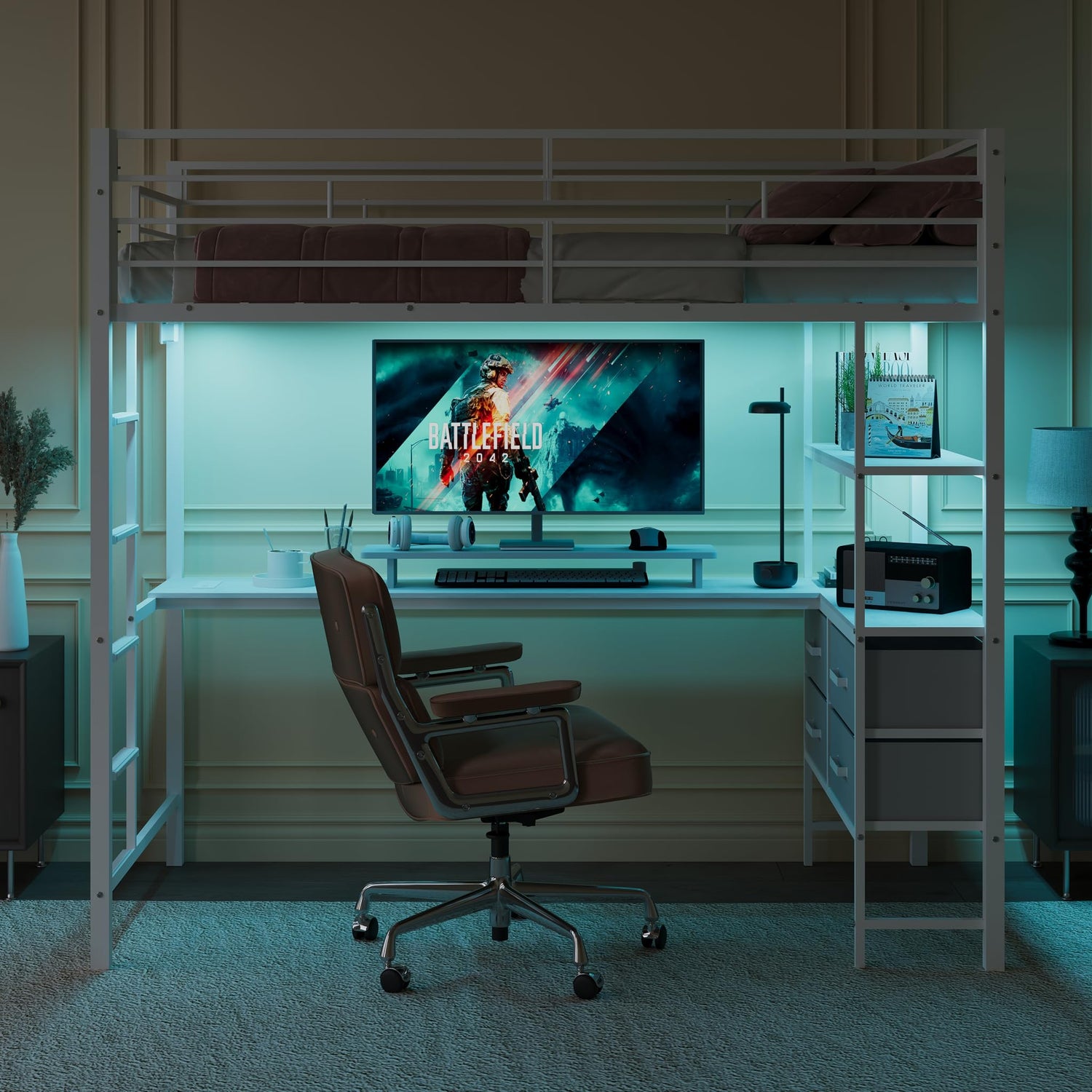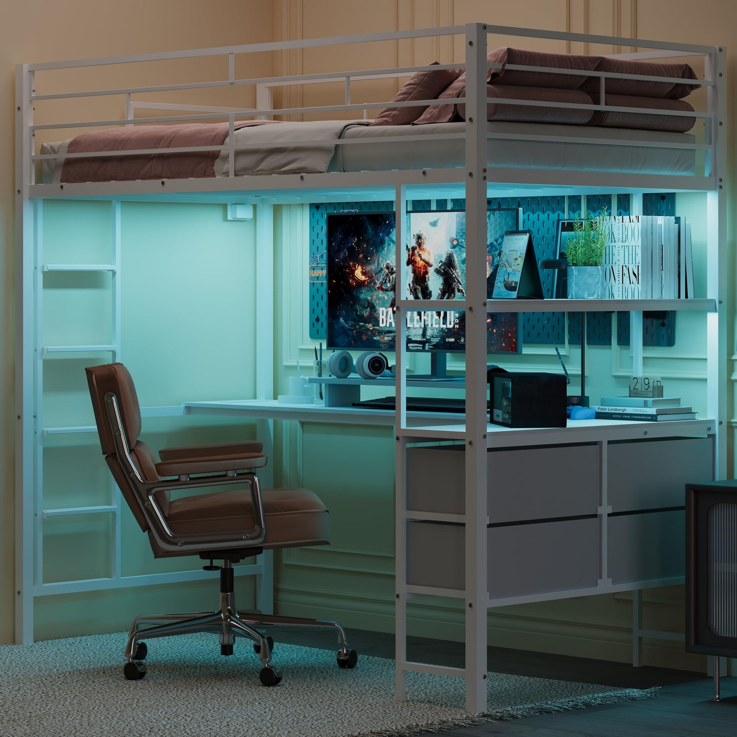 - 【Multifunctional & Customizable】Charging stations on and under the bed support various devices. The L-shaped desk, storage shelves, and 4 drawers offer plenty of space for study and storage. LED lights in many colors can be adjusted via phone, remote, or switch. Create your own cozy space.