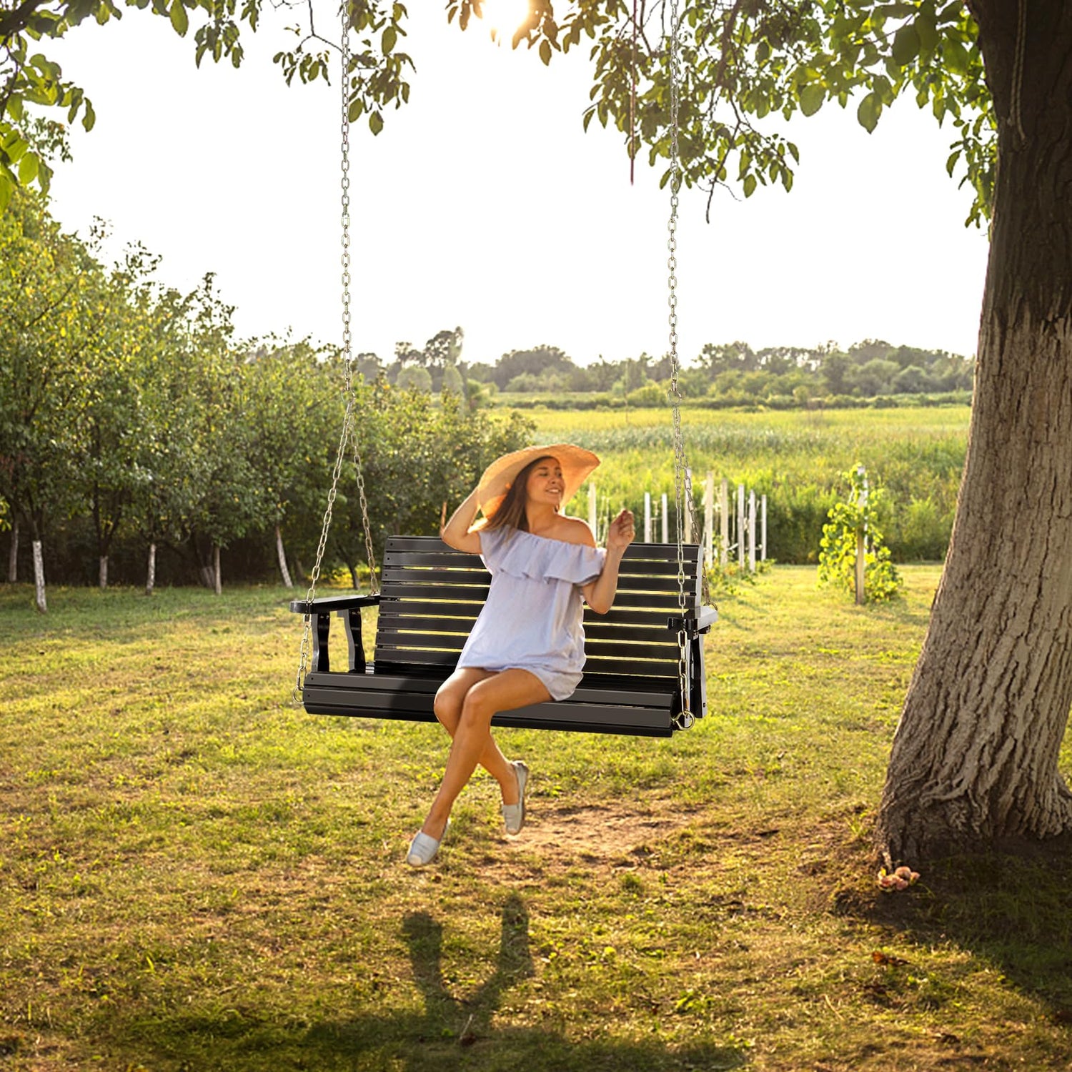 - Ergonomic Design - Our wooden porch swing curves in the knee area to provide you the best sitting experience. It will never hurt your knees or backs. Just sit on it then enjoy your leisure time