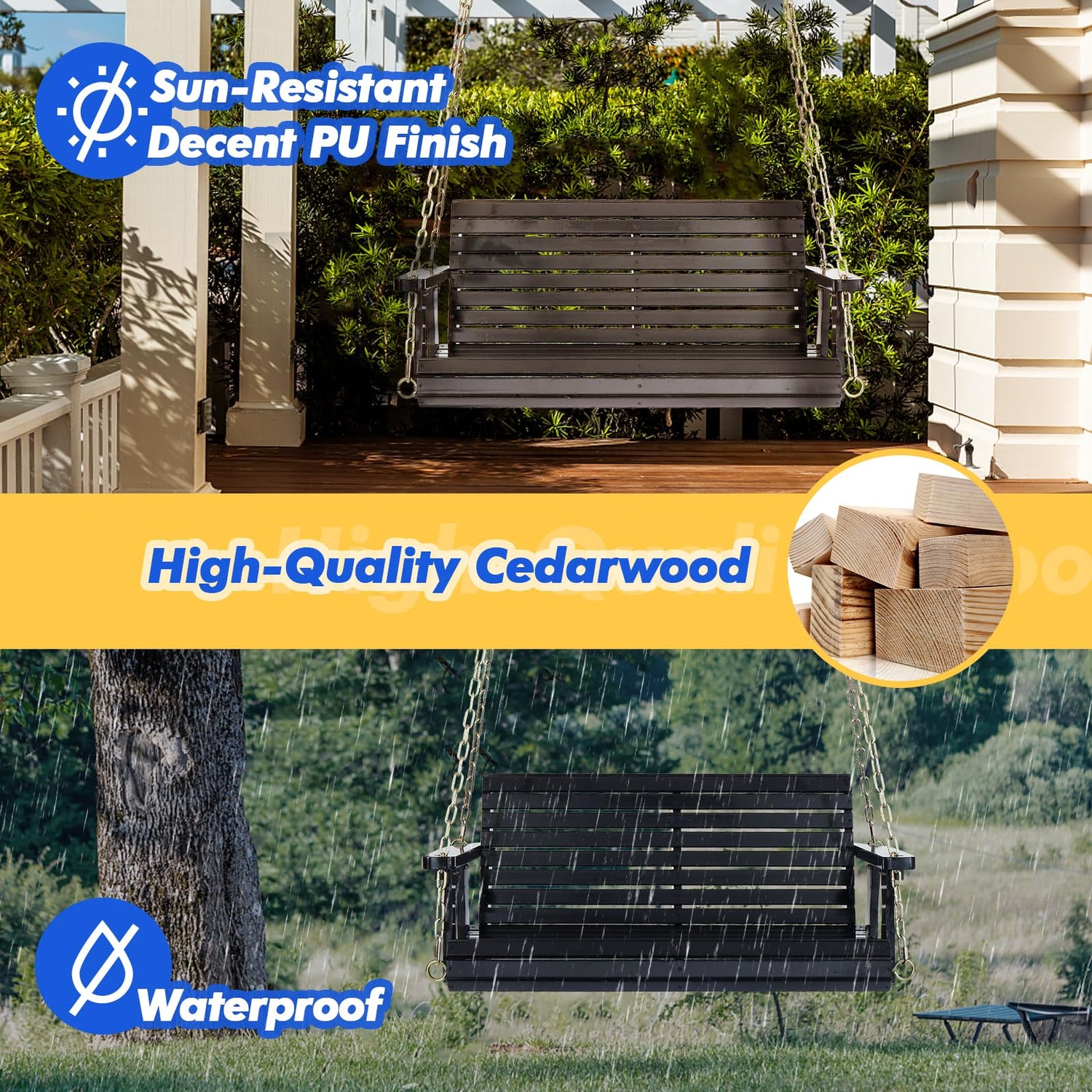 - Well-Coated Surface - Compared with other swings with raw wood material, our porch swing chair outdoor are more durable with its well-finished surface